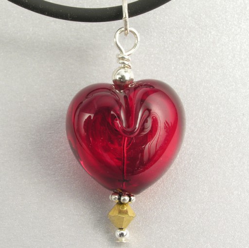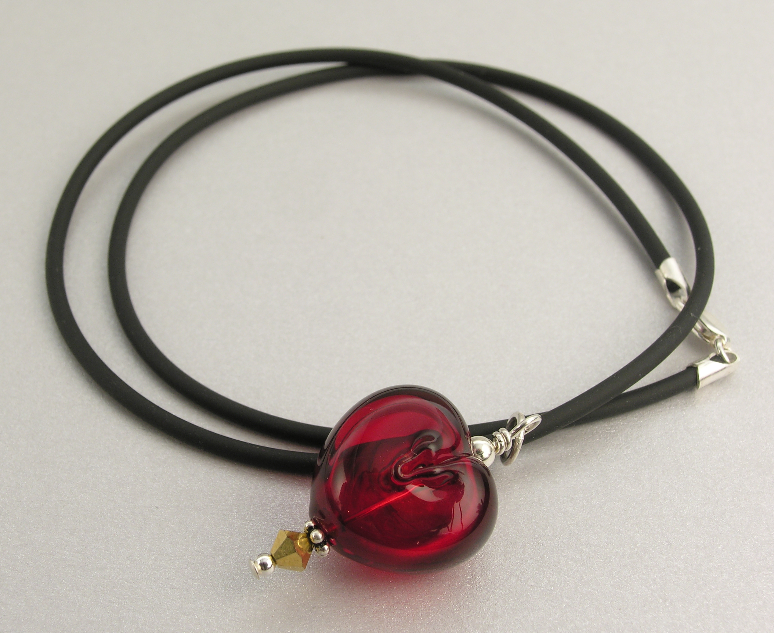 lampwork soda lime heart, sterling and bali silver, swarovski crystal, rubber. Photographed 22Jan2008, and probably manufactured about that time. Nikon coolpix8400, 1/15sec, f6.2, photoflood lighting.