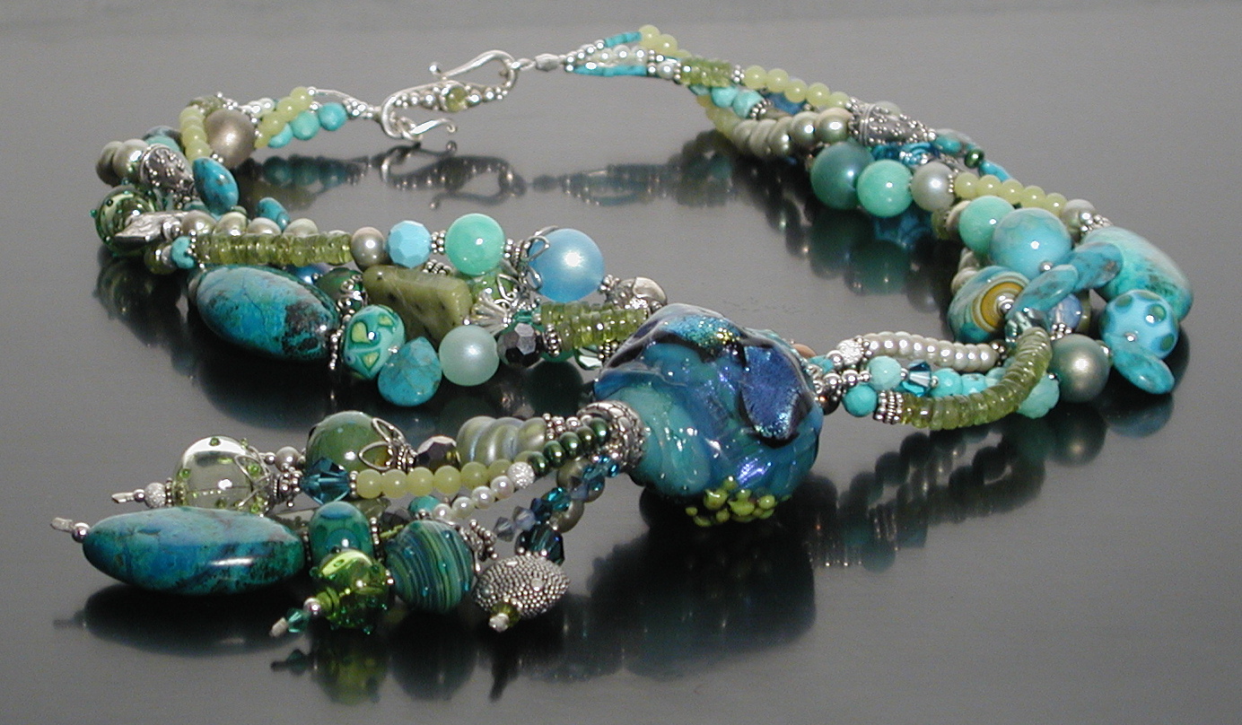 multi-strand necklace, probably late 2003 or early 2004. Bullseye dichro focal, pearls, turquoise, azurite, peridot, jade, bali silver; photographed 19jan2004