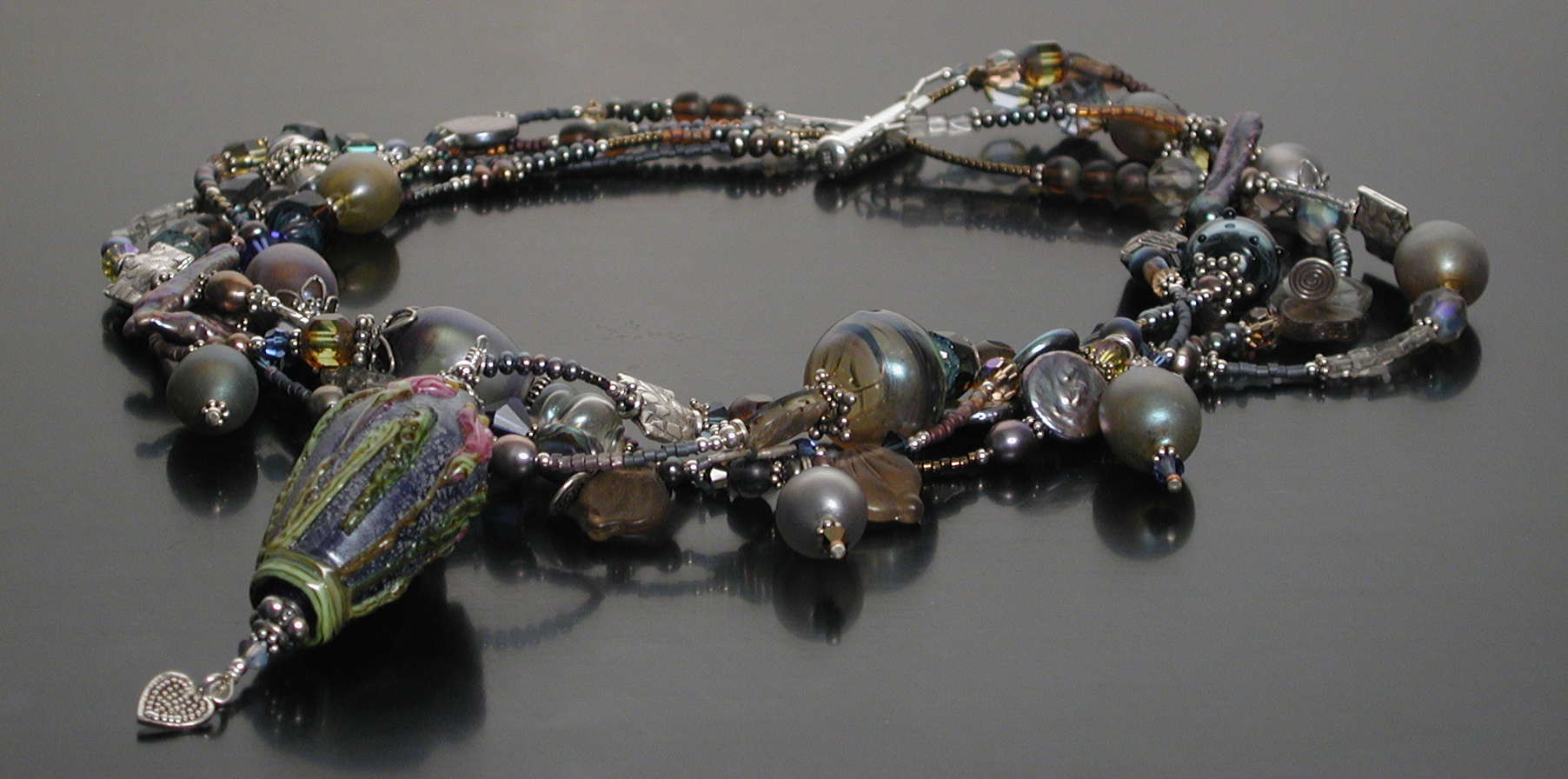 multi-strand necklace, probably late 2003 or early 2004. lampwork floral vessel focal, pearls, pxie dust beads, silver