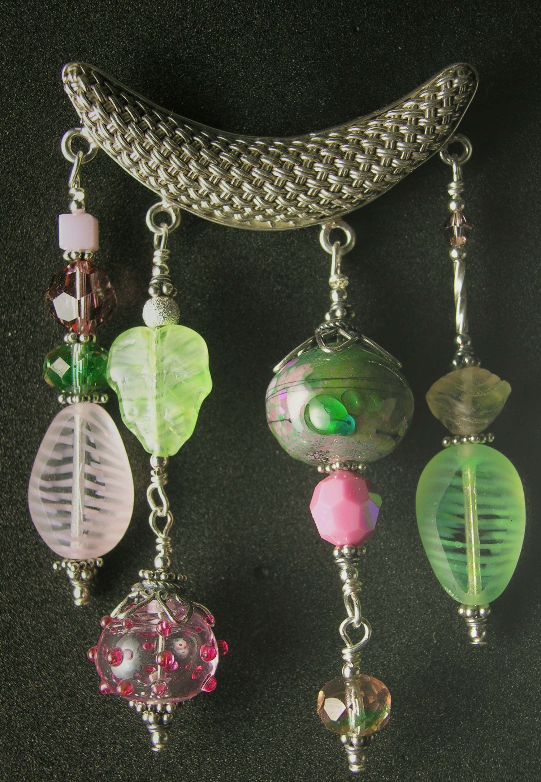 The first pin is designed to be a little more conservative, that is, shorter. Keeping in mind that the layout of dangles is basically mirrored in the second pin, the biggest difference is the extension, with the twisted wire link underneath the green abstract (Monet) bead, which serves as the bead focal of these pins.