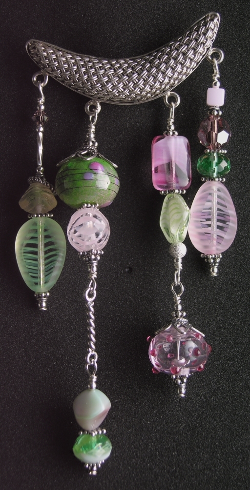 These pins are a wonderful example of the joys of series—of course, all of the pins are an overall series, but these pink and green pins illustrate especially well how a bead-stringer's mind works: just as with language, you start with small units which then can be built up into larger ones. Poetry, with its emphasis on form and compactness, perhaps makes for the strongest analogy.
