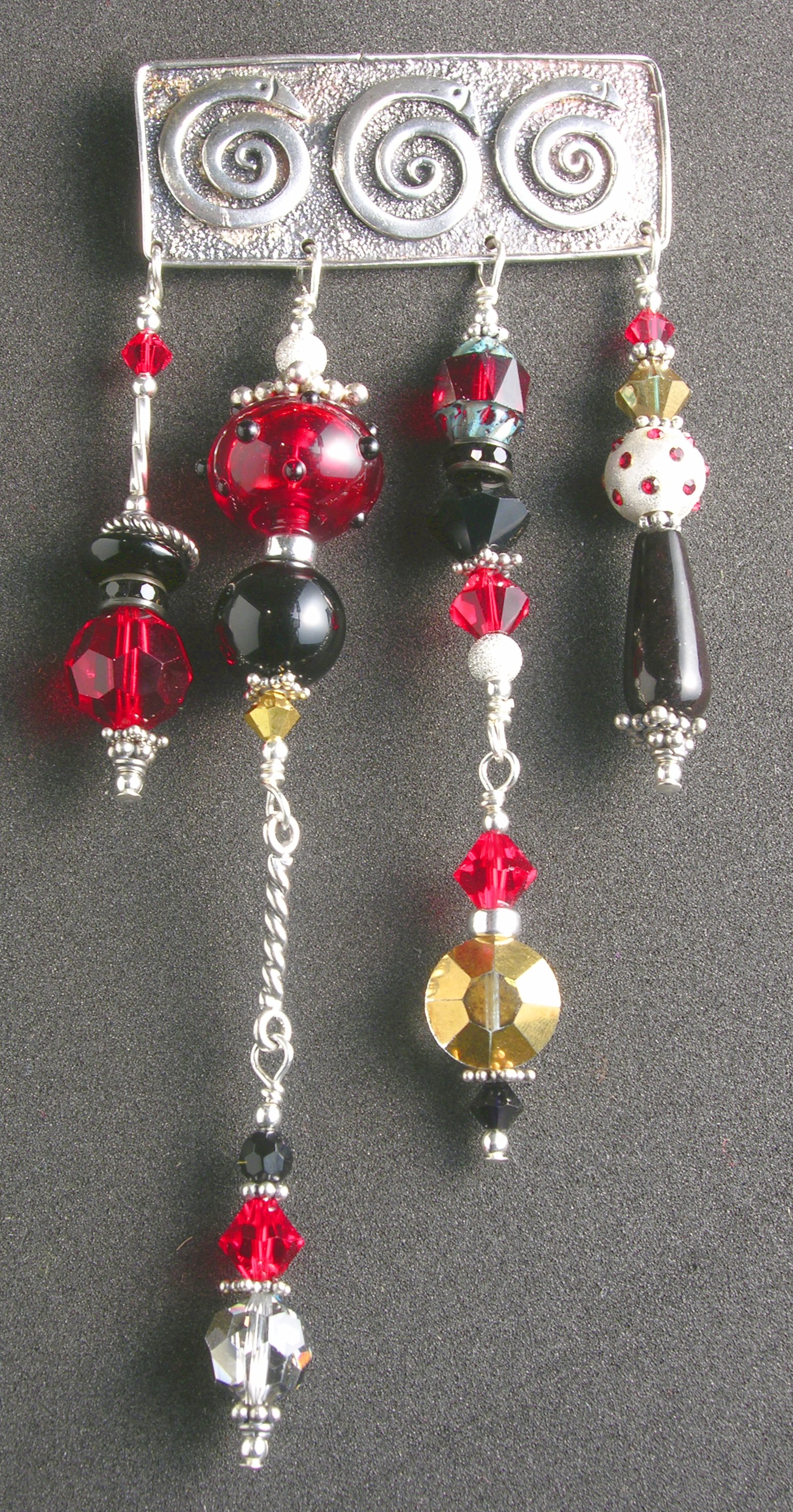 Though to the last to be posted in the series, this elegant piece of jewelry in a red and black color scheme was the first to be photographed (and the first constructed, as well, I believe.) I just love that textured silver bead set with tiny red crystals.
