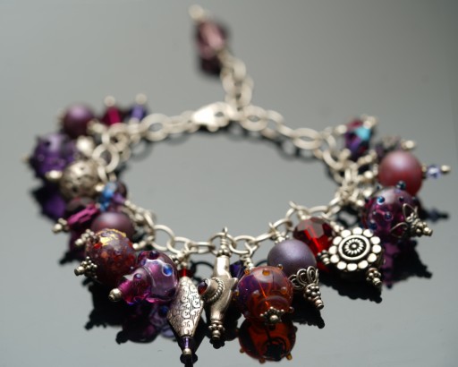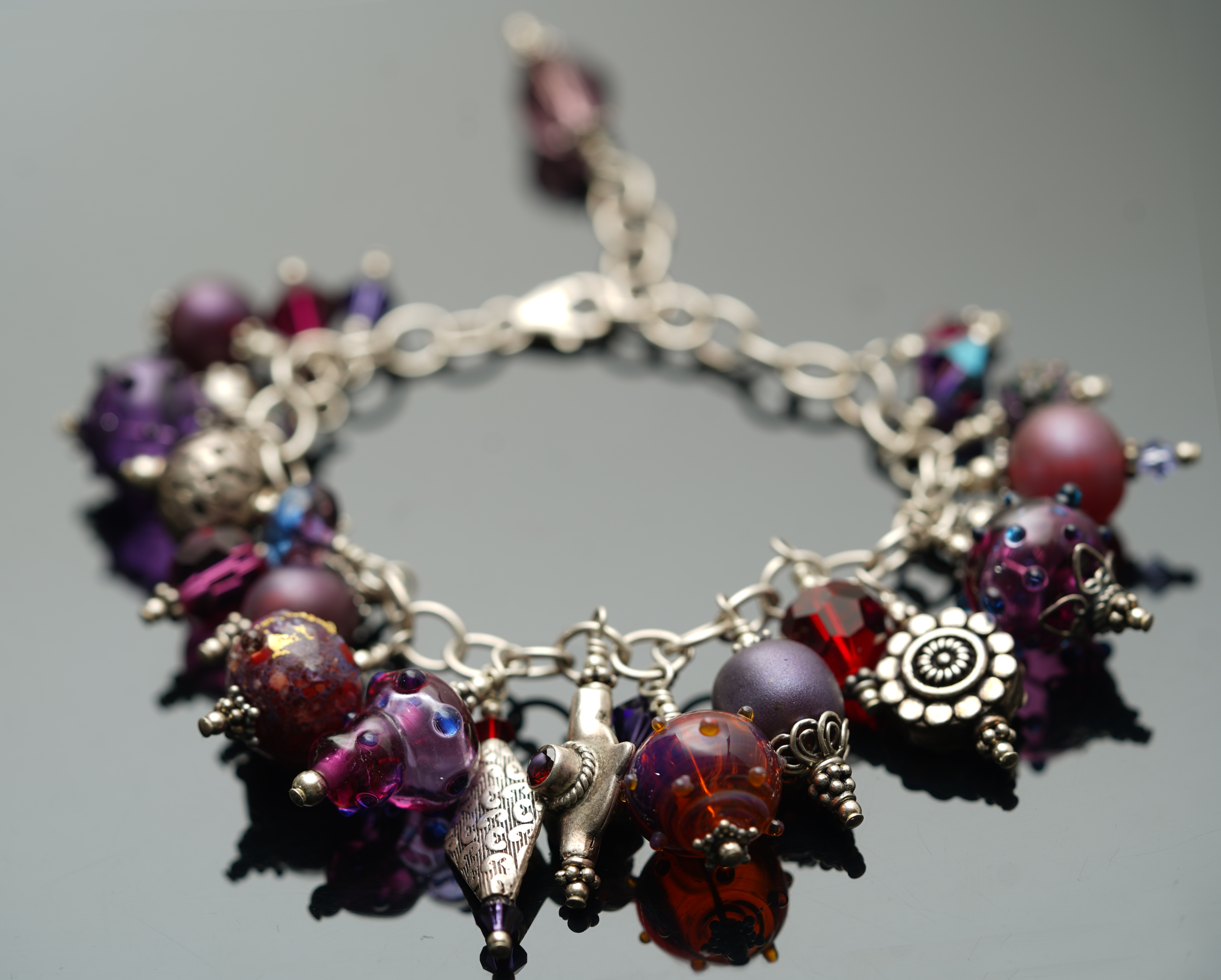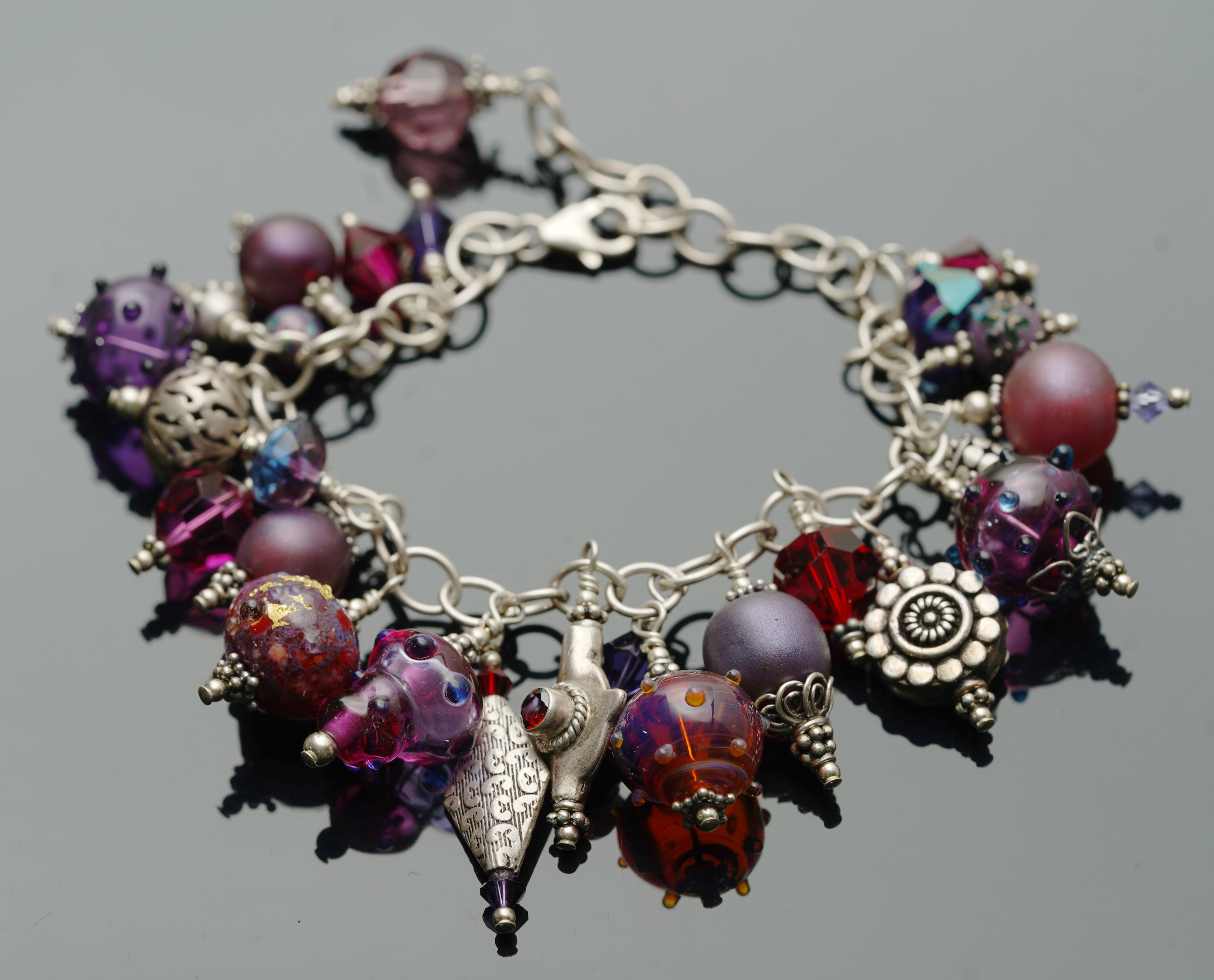 Page made this wonderful charm bracelet featuring pixies and dotties in effetre, check glass and boro, with gorgeous Bali silver accents almost 20 years ago, back in 2006. I just love it, so despite having tried sprucing up an older photo of it, was happy to have had the opportunity to make some newer photos of it. And I gotta say, where the new glass really shines is the depth of colour. Yummy!