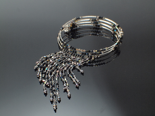 This gorgeous piece was made many years ago by my friend Page, and as you see it involves a lot of wirework: each dangle consists of up to 14 individually gallery wrapped 4mm beads, either swarovski crystals or pearls. Note also that each dangle is mounted on a soldered jump ring: this sort of attention to detail helps to give the piece a wonderfully fluid drape—Page's pieces are meticulously engineered.