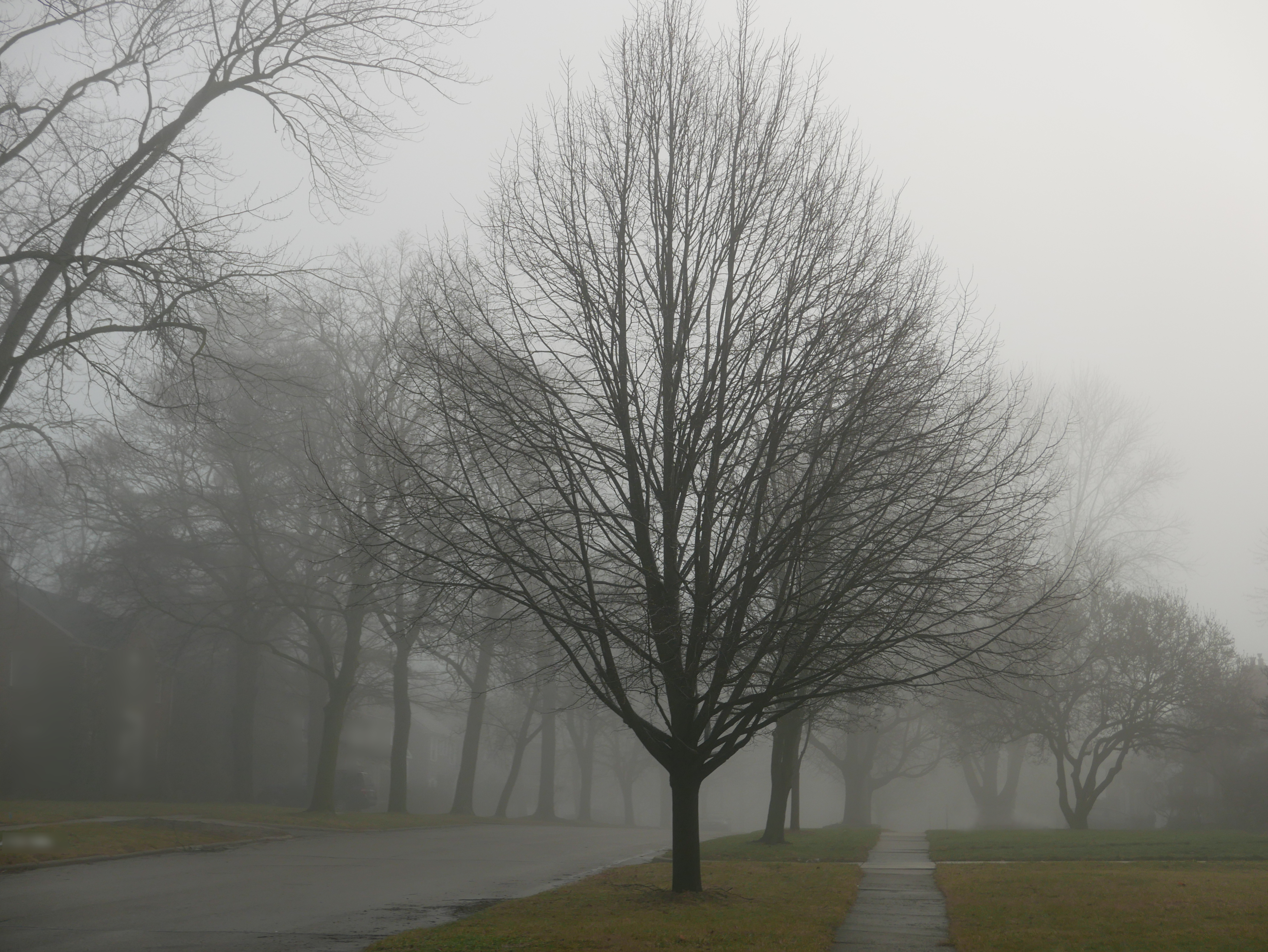 Since this is supposed to be artistic photography, I edited out some distracting white blots—either newspapers or little snow clumps—in the city lawn, softened the windows in the houses, and removed an auto in the distance.