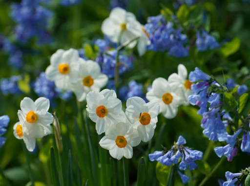 On Sundays, I often go riding with my friend, who kindly tolerates my propensity for hopping off the bike to take pictures, such as this pretty roadside flower bed of Virginia bluebells dotted with narcissi: