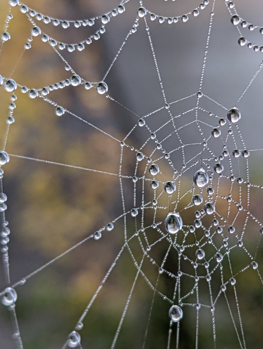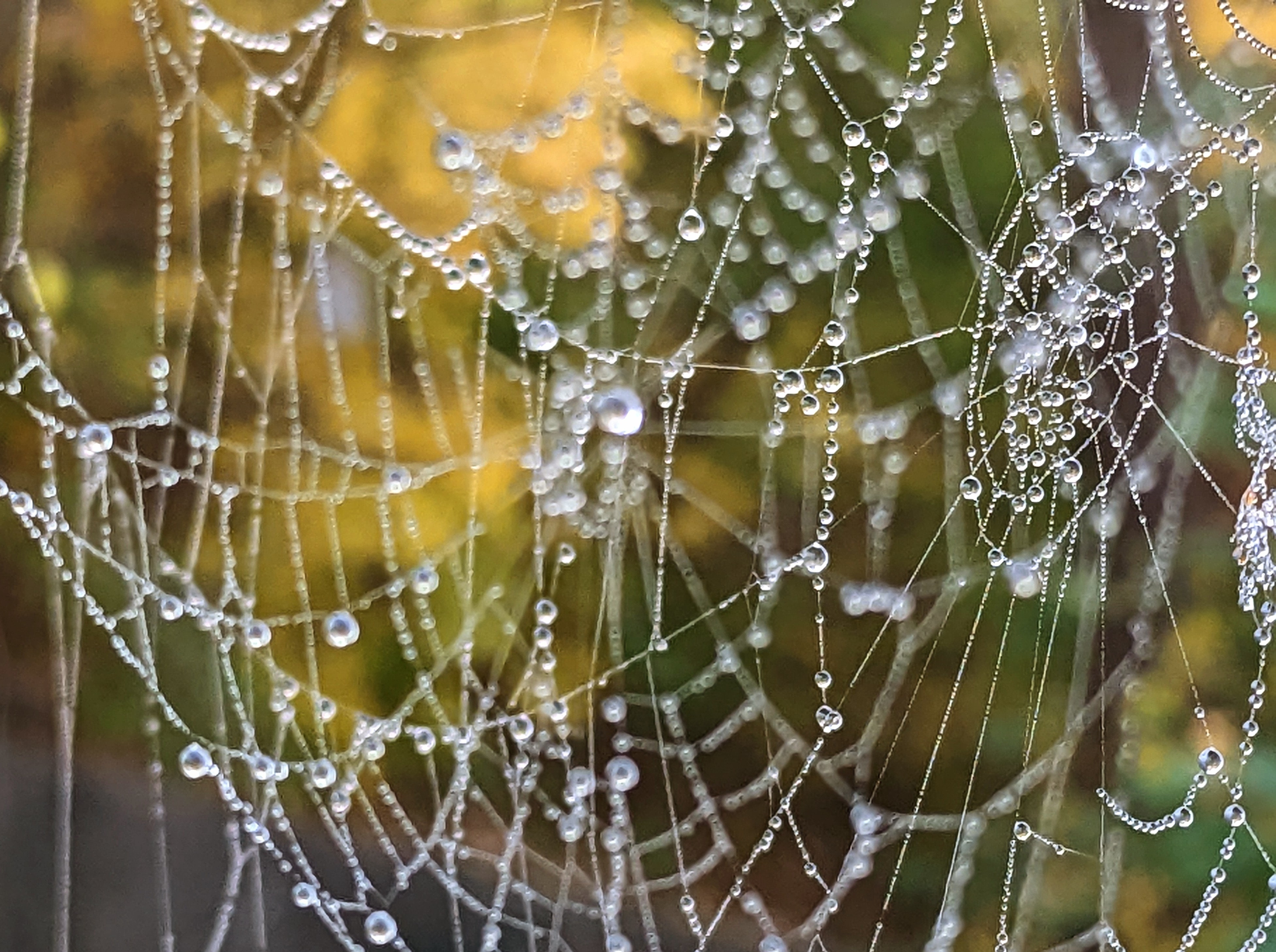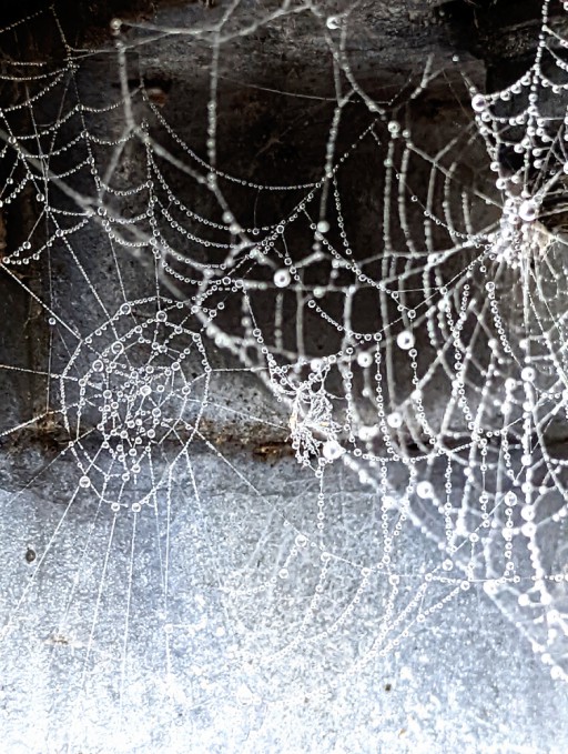 Still, these webs, located on a bridge over a nearby river, were extra laden with dew and fog, making for a beautiful effect.