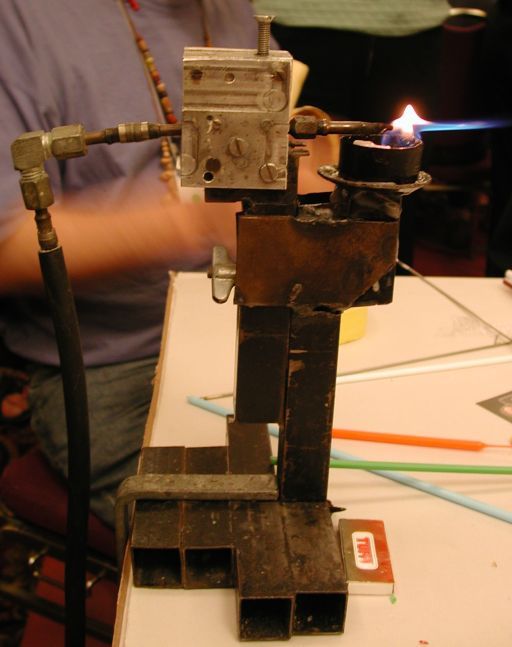 Those of us who have appreciated his help on the Forum got to meet the man in person at Gathering this year. Softspoken, outgoing, and quite funny, he enchanted everyone with his meterslong strings of “seed” beads, all carefully numbered experiments with color mixing. He could go right to a specific number, say ‘987’ too. These little beads were made, he said, on the torch he brought with him, a (likely) handmade affair running on paraffin wax cubes and compressed air.