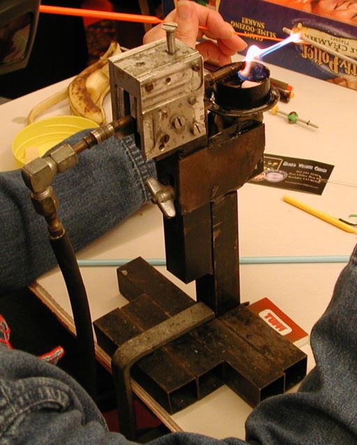 It was a huge hit at Open Torch. I tried it myself, and found it required a good deal of discipline. Firstly, it makes a hothead screamingly fast by comparison, and you learn to control your breathing so as not to upset the flame. No glasses are necessary to shield your eyes. Though Dietmar claims to have made borosilicate beads with it, I found working Effetre stringer to be plenty challanging enough. For me the biggest difficulty is that the smallest mandrel I could lay my hands on was 1/16”, and get it hot enough for the initial wrap made it difficult to make a hollow bead. I persevered, however:) Under normal circumstances, working with a flame that small, I'd want to use a .045 or .035” diameter mandrel, so I could get it hot more easily.