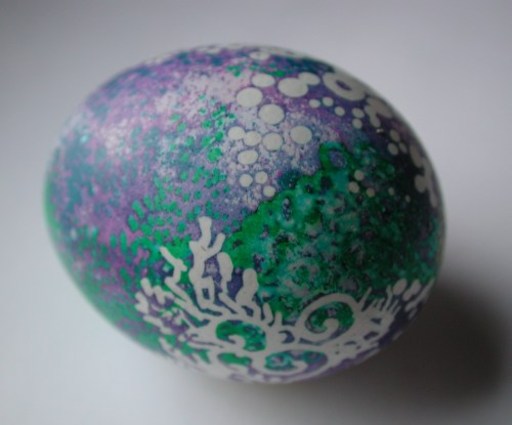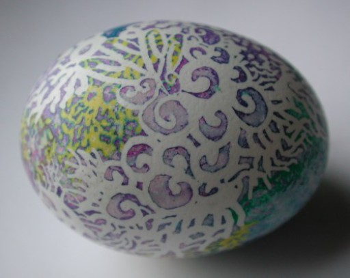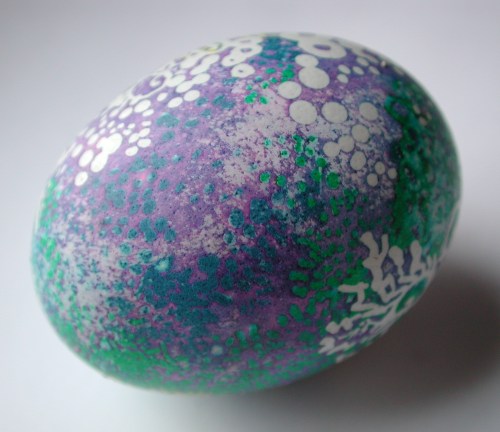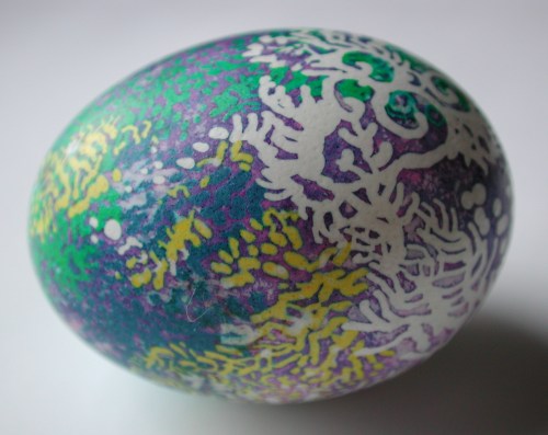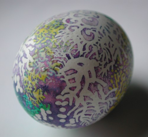Despite some peeling, I was very happy with the way this egg turned out. I thought the white, yellow and particularly the green patterns were very successful. Next year I might start with green, thus limiting the sequence to three dips to see if that helps with peeling. I could also try using wilson cake decorating dyes...I haven't thus far because I'm unsure of the best salt/vinegar/dye ratios. (Those kits give a premeasured amounts of dye—with 3T vinegar to 1/2 C water. Hmm....)