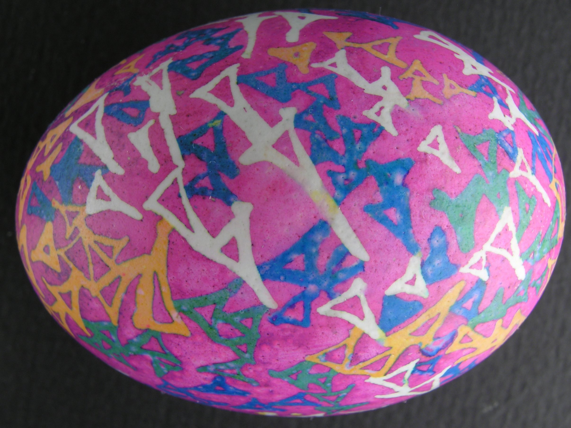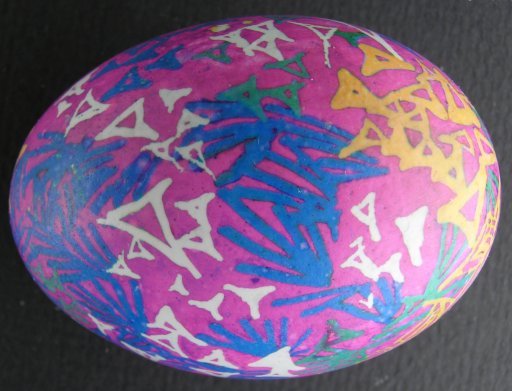 Naturally I quickly got bored with making triangles and soon added random hatching to the mix. Originally I thought I was making a purple egg with blue and green patterns, with touches of yellow-orange for zing. But once again upon rinsing in hot water, my purple turned into fuscia, and the result is that neither the colors (nor the designs, which I couldn't see particularly well while I was making them) work together very well. On the other hand, at least the eggs aren't bleeding all over the place, as they will do if the wax is merely picked off: the younger generation went for this method, and all that excess dye promptly deposits itself upon the fingers of any (un)lucky recipients. So, an advantage to traditional, as opposed to cake decorating dyes: greater color-fastness. Moreover, frustrated as the cheap dyes make me, they do have this charming habit of speckling, which combined with cold-egg sweating, makes for subtle, and very attractive variations in color.