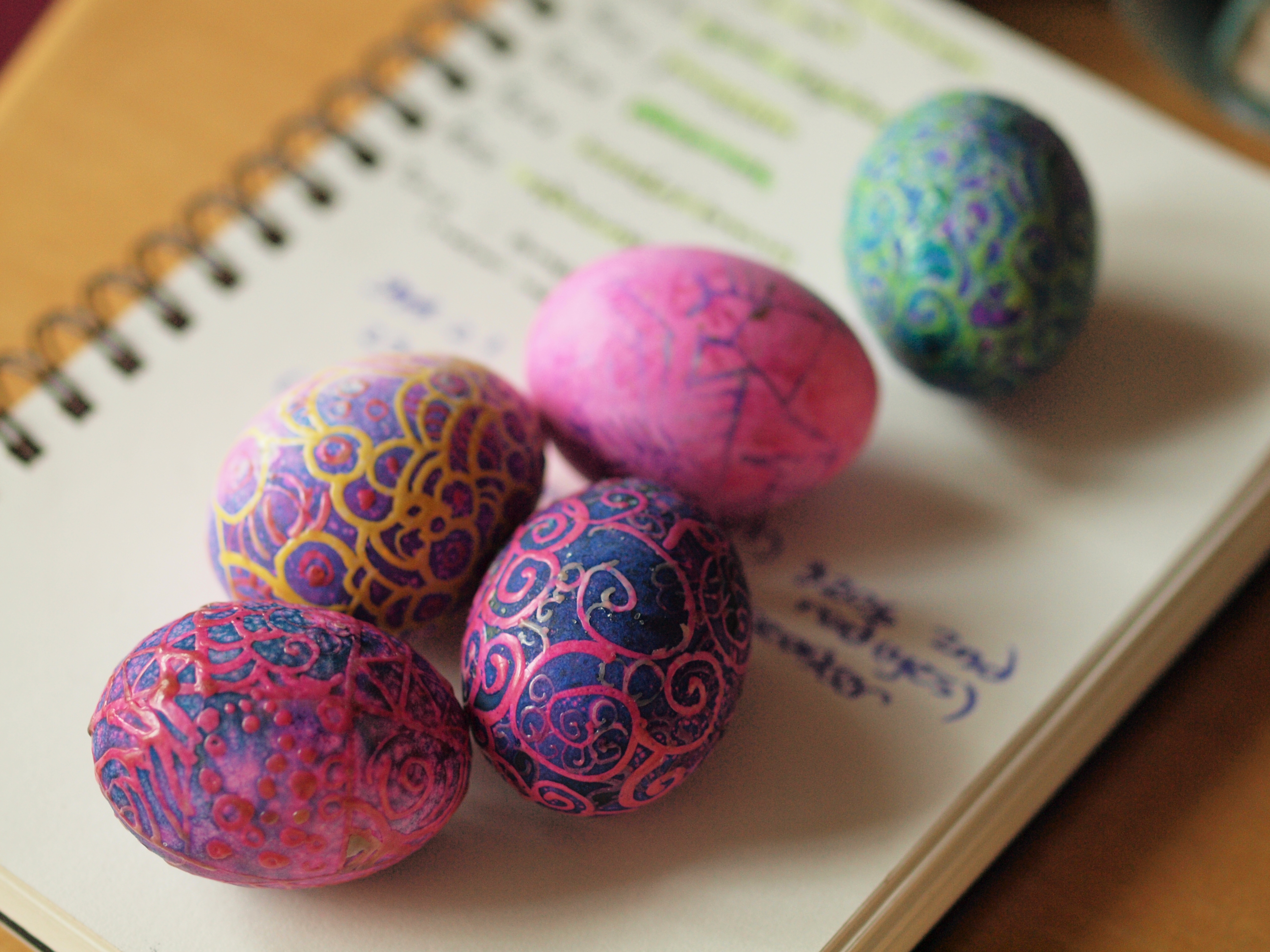 The problem with traditional pysanky (singular pysanka) is that the Ukranians use raw eggs (which they empty) and aniline dyes (which are not food safe) and clean the wax off with toxic solvents (such as lighter fluid.) I was completely unable to drain any eggs, even pricking it with two holes, let alone one, and wasn't thrilled with the idea of using flammable, toxic solvents to remove the wax.
