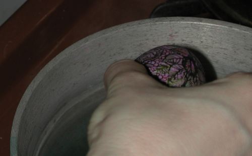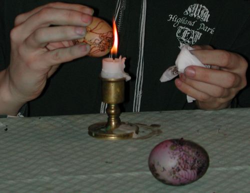 After you've finished putting on all the designs and dye on the eggs, allow them to dry thoroughly. You then have two options for removing the wax: you can either heat in a candle flame and wipe it off (I believe some tradtional pysanky artists use this method instead of the lighter fluid technique, but I couldn't swear to it) or dip the egg, a bit at a time, in water that has just finished boiling.