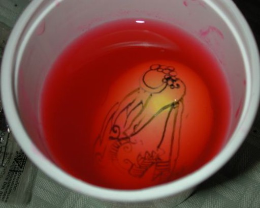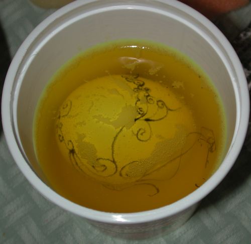 When you have a basic design, dip egg in first color–traditionally, yellow. It should yield white lines on a yellow egg, but it seems to me that often the yellow dye creeps under the wax, though this ceases to be a problem with later dippings, as far as I can tell. After it's soaked awhile in yellow dye, fish egg out, and let it dry. Then draw some more designs on it, dip it in a darker color, let it sit, fish it out, let it dry...lather, rinse and repeat.