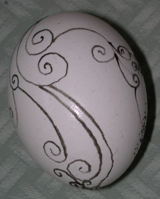 Either wash hands to remove excess skin oils, or use a tissue to hold egg. Light candle; heat stylus in falme; press into wax. The stylus consists of a conical metal tip with a small (~1mm) hole; the wax is drawn up into the cone, which acts as a resevoir. Keeping tip of stylus perpendicular to surface of egg, draw design. Lines work well; dots don't. You will quickly get into a rhythm of heat, dip, draw. Sometimes I find the wax hardens before I get it all onto the egg; then I just heat and use.