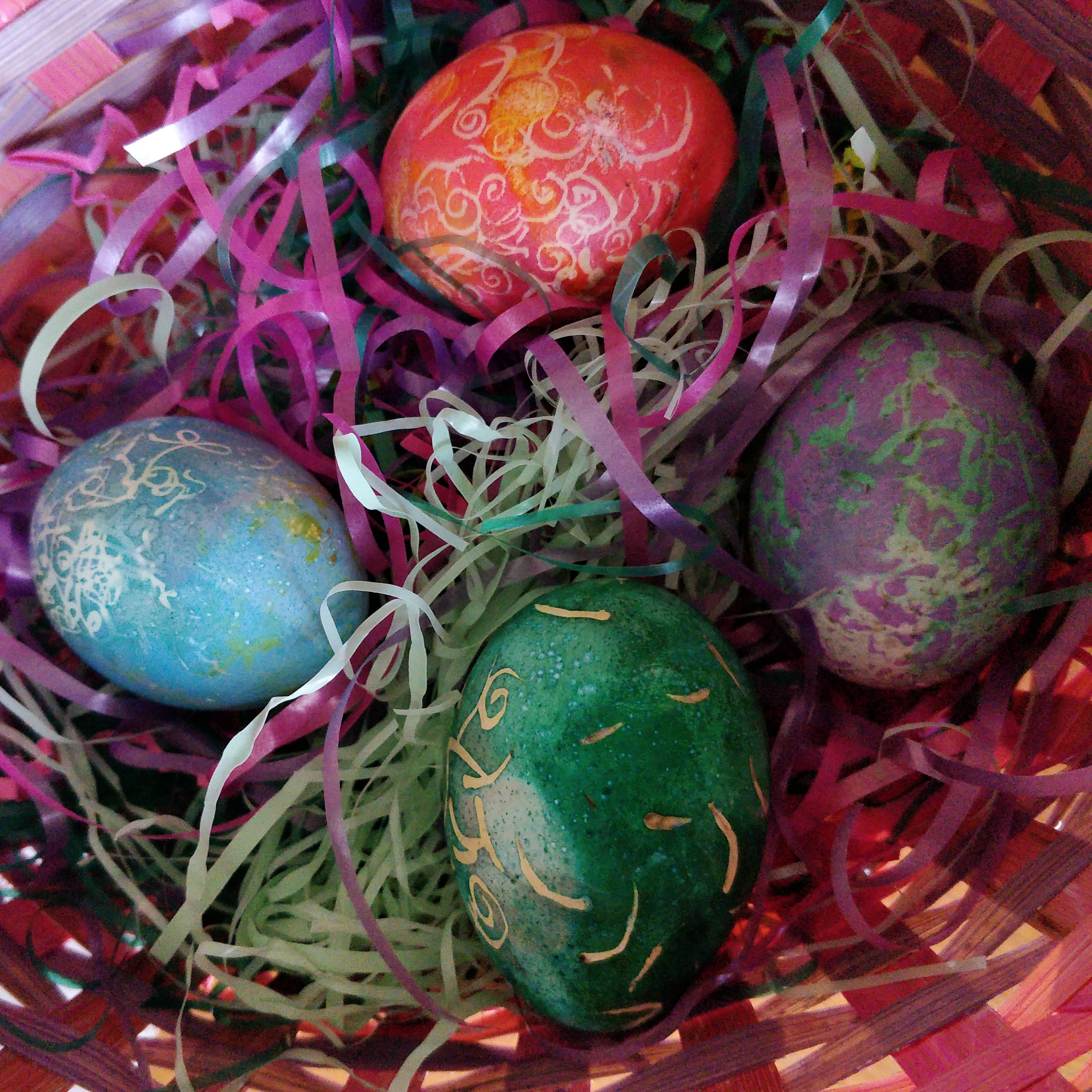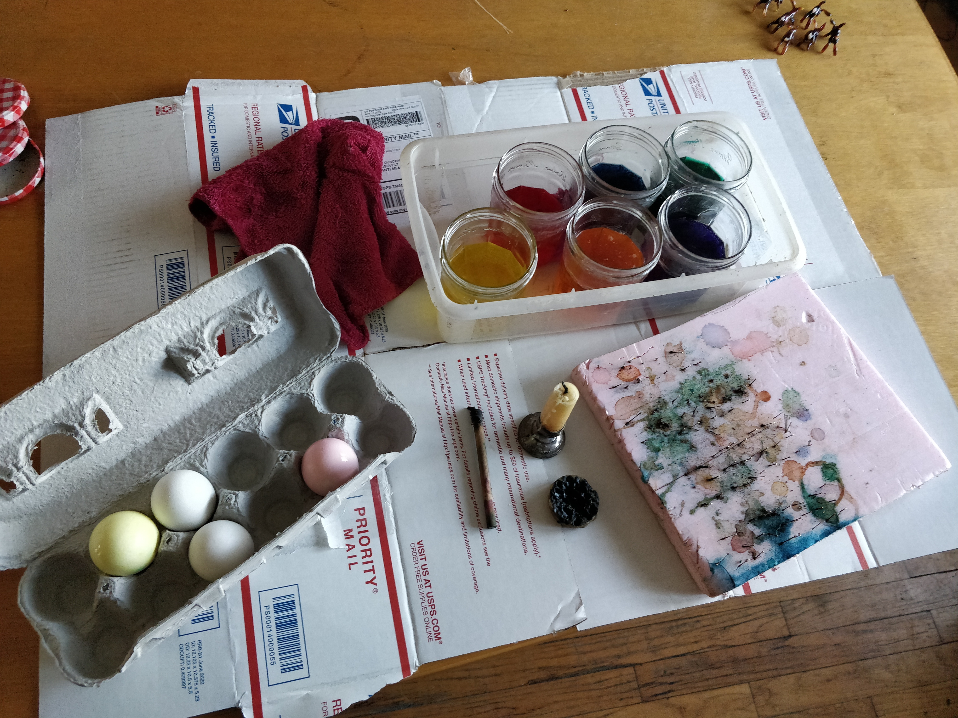 It's been years since I've done pysanky, or mebbe I'd better call these “pysanky” because I've strayed pretty far from the tradition; partly because we no longer have exchange students to whom we wish to expose the US custom of dyeing eggs, and not least because the pandemic sort put a damper on this sort of celebration.