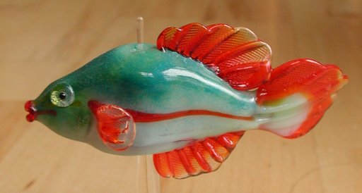 Thank you again for your kind comments about my beads: my dear friend Page has the honor of introducing me to your work, a frit and powder hollow with a quite unusual (Bullseye?) pink cast. She also gave me one of your fish, specially picked out in a (teal) green and (red) orange color scheme (one I love and she hates: something of a joke between us) that always has had pride of place in my collection (so you see, I could have my principles and eat them too, as it were, with regard to your beads.)