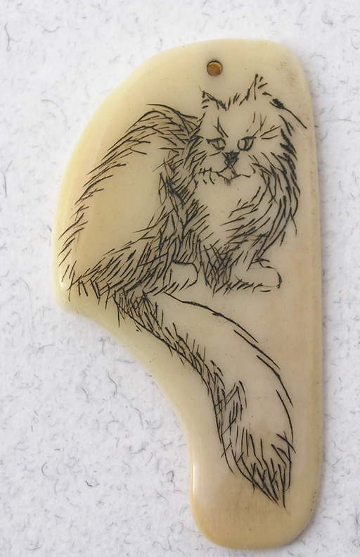 This is one of many, many little scrimshandered pendants I made in the early part of my art fair career. I bought (what I recall being) 3 pounds of fossilized walrus ivory scraps, though such a huge amount seems incredible now. At any rate, I had a lot of it. I would fit the drawing to the shape of the piece, and cats like this one, along with dragons, were my best sellers.