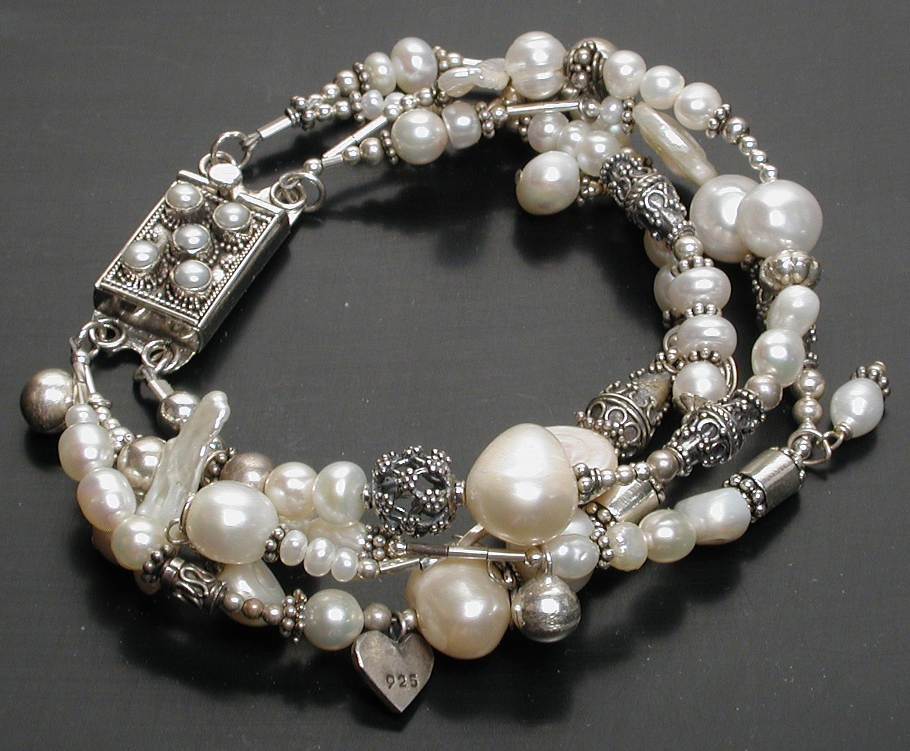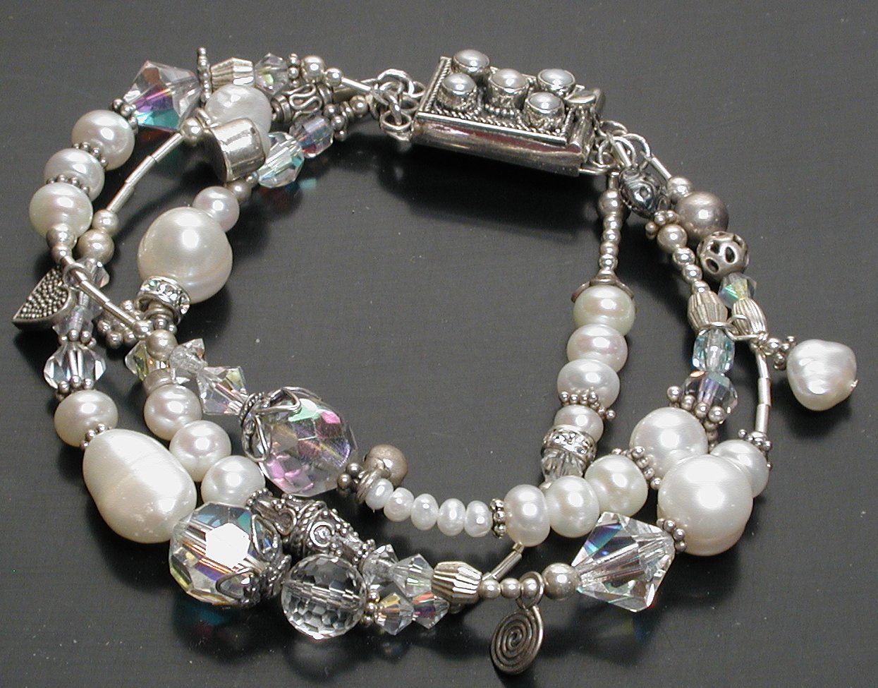 It's kinda funny, the way your mind can play tricks. I clearly recall making two bracelets, both multi-stranded out of mixed pearls, with bali silver, and one with crystal as well. But I'd have sworn up and down that my favorite had a stick pearl in the clasp. Yet both bracelets shown here have rectangular clasps, each set with 5 cabuchons.