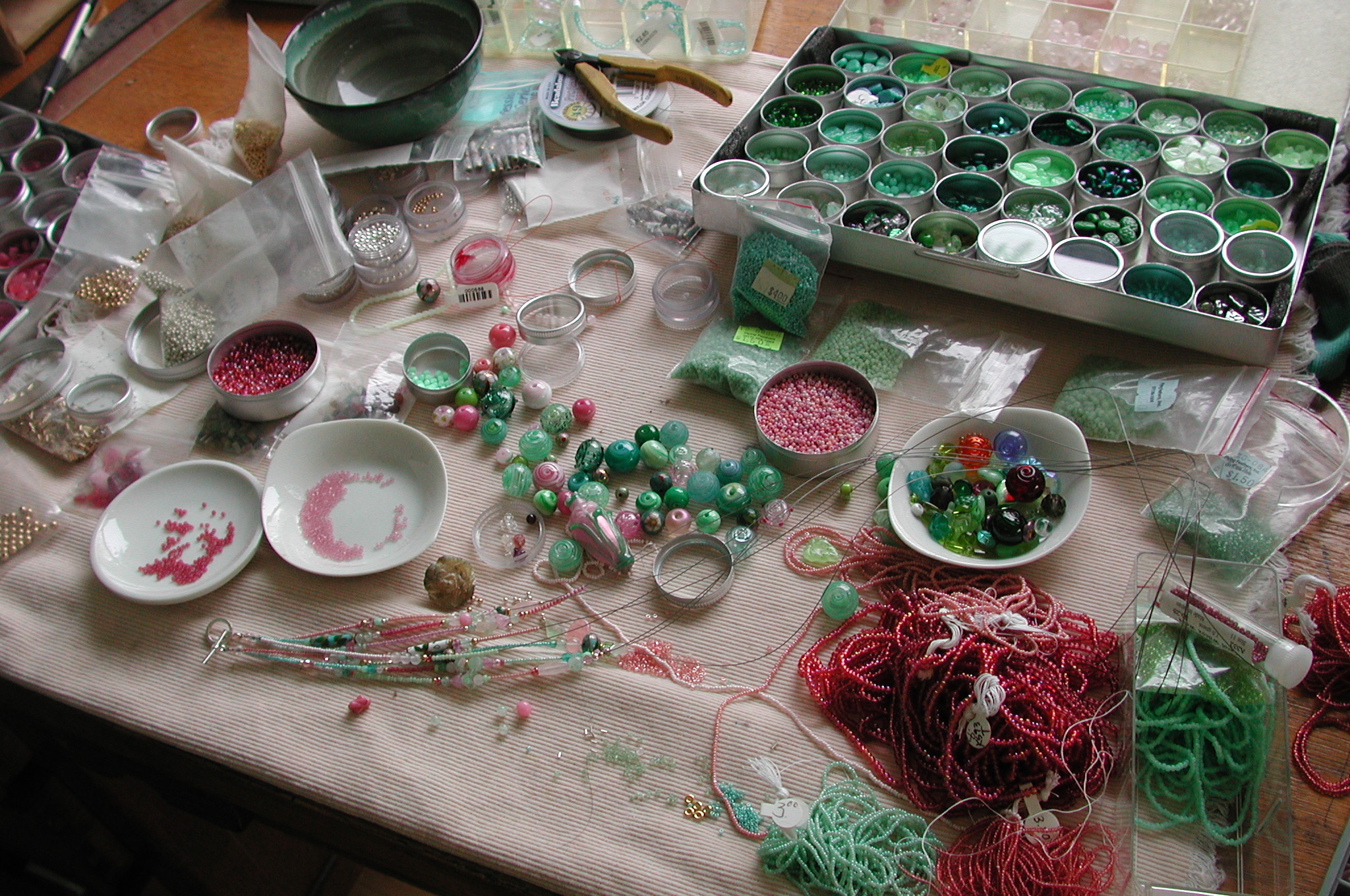As you can see from the picture, getting started on a major project like this one involves a lot of beads; some, of course will not ultimately fit in with the final design, and are discarded, such as the garnet red seed beads on the right. This necklace basically follows the lumpen format, which means I start at the back, with the cable doubled (folded over) at the clasp; the ends will be crimped at the bottom of the tassel.