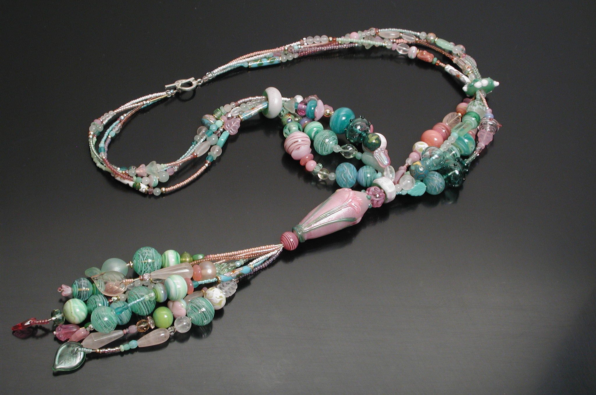 Note the large hole ‘collars’ constricting the strands between the small and large beads. I made these on, um, gee now that the piece has sold I can't check—but either 1/4” tubing or big hole mandrels from arrow springs. 49 stranded beadalon, silver, glass, (including lampworked sodalime and lead glass by the artist) rose quartz. Completed 03apr05. Private collection.