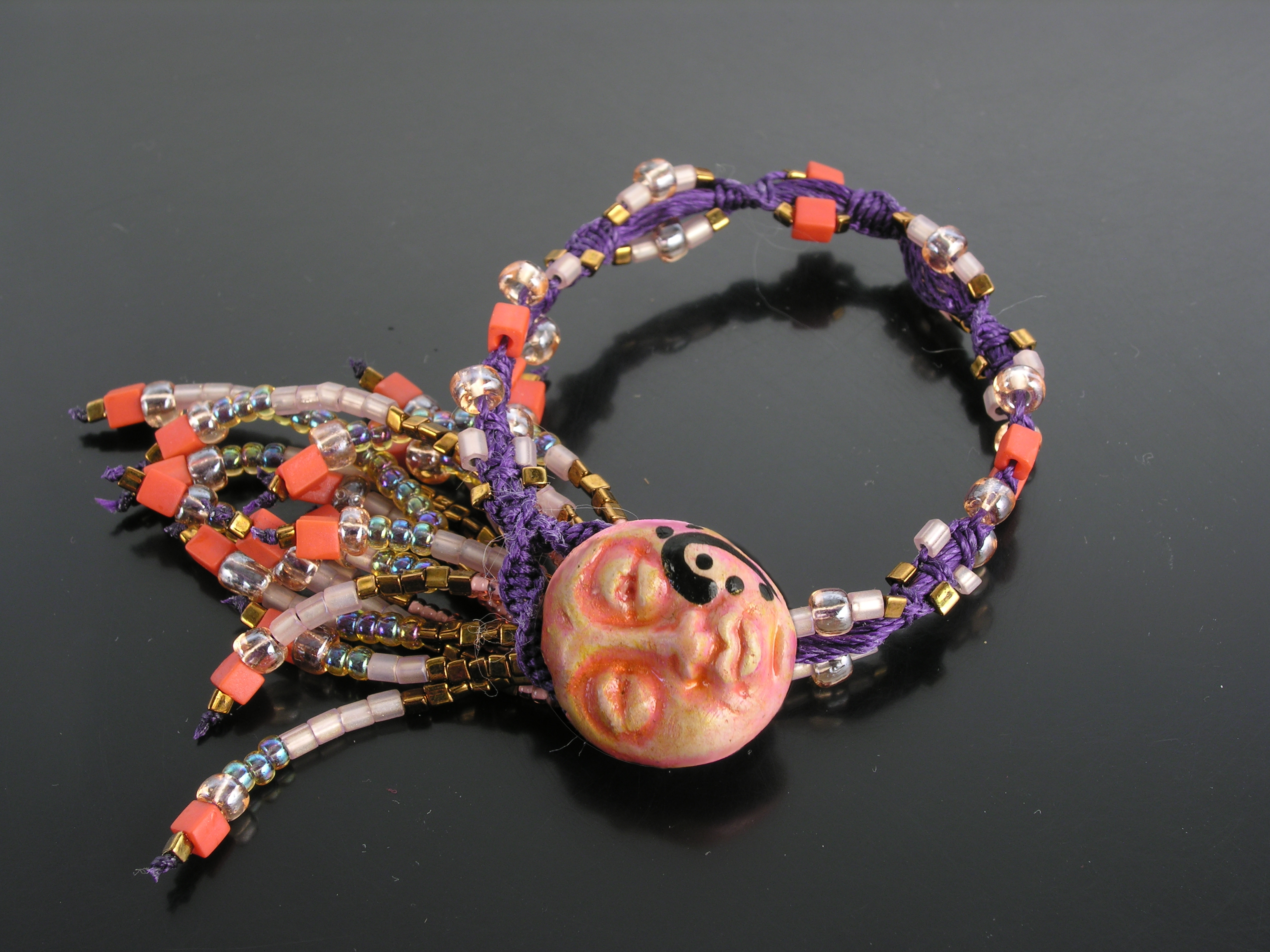 Macrame bracelet. The ceramic button is by Kathleen Robinson. Other materials: nylon, glass, superglue. 7 inches at shank; 9” including fringe. 2008, (executed by) sylvus tarn. I combined two exposures of the picture to light both button and beads.