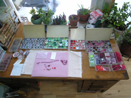 I often tidy up my studio around St Patrick's Day, as a way to celebrate spring, or the new year, or the coming of the green. Whatevs. My records show I spent two days documenting studio tidy-ups in 2008;[1] then I was finally ready to start something in my freshly cleaned up space. Meanwhile, the client had herself purchased some schlocky, bright purple color- and finish-enhanced freshwater pearls. They were a beautiful color, but, um, basically plastic. Being a snob, I couldn't bring myself to actually buy any; but I was perfectly happy to string them (for someone else, of course. It's like when you won't buy [appalling junk food] but happily eat it at someone else's house:)