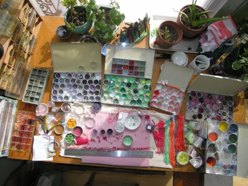 Since Deb had actually spent money on supplies I got off my ass and strung the piece. Now I was ‘ramped up’ for Deb projects, and figured I ought to get this piece done too (and use up more of the horrid pearls....) So I selected it as the first project to despoil celebrate my freshly cleaned studio. After spending 20 minutes or so pulling beads and carefully arranging them for the picture[2] (17:08 – 17:29) I photographed the setup and then worked to 18:58—just about exactly an hour and a half.