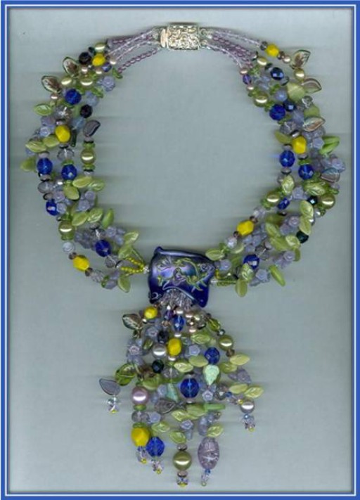 I made several focals (three?) She purchased two of them, but the curvy one didn't do it for her. I loved it, though, and decided to try stringing something like she'd done with it. She sent me a pic of her finished piece which I show above. Yummy.