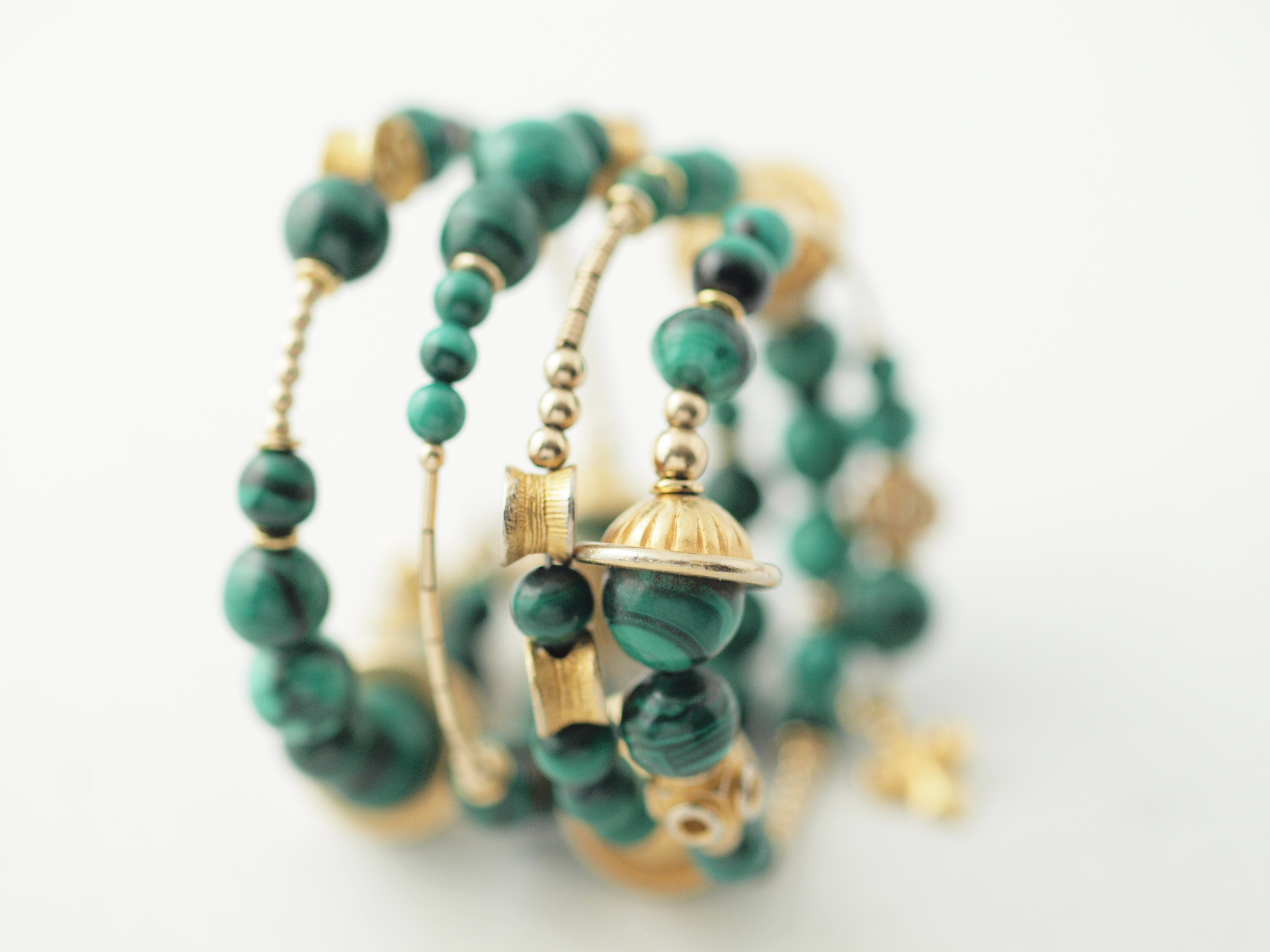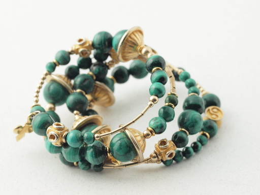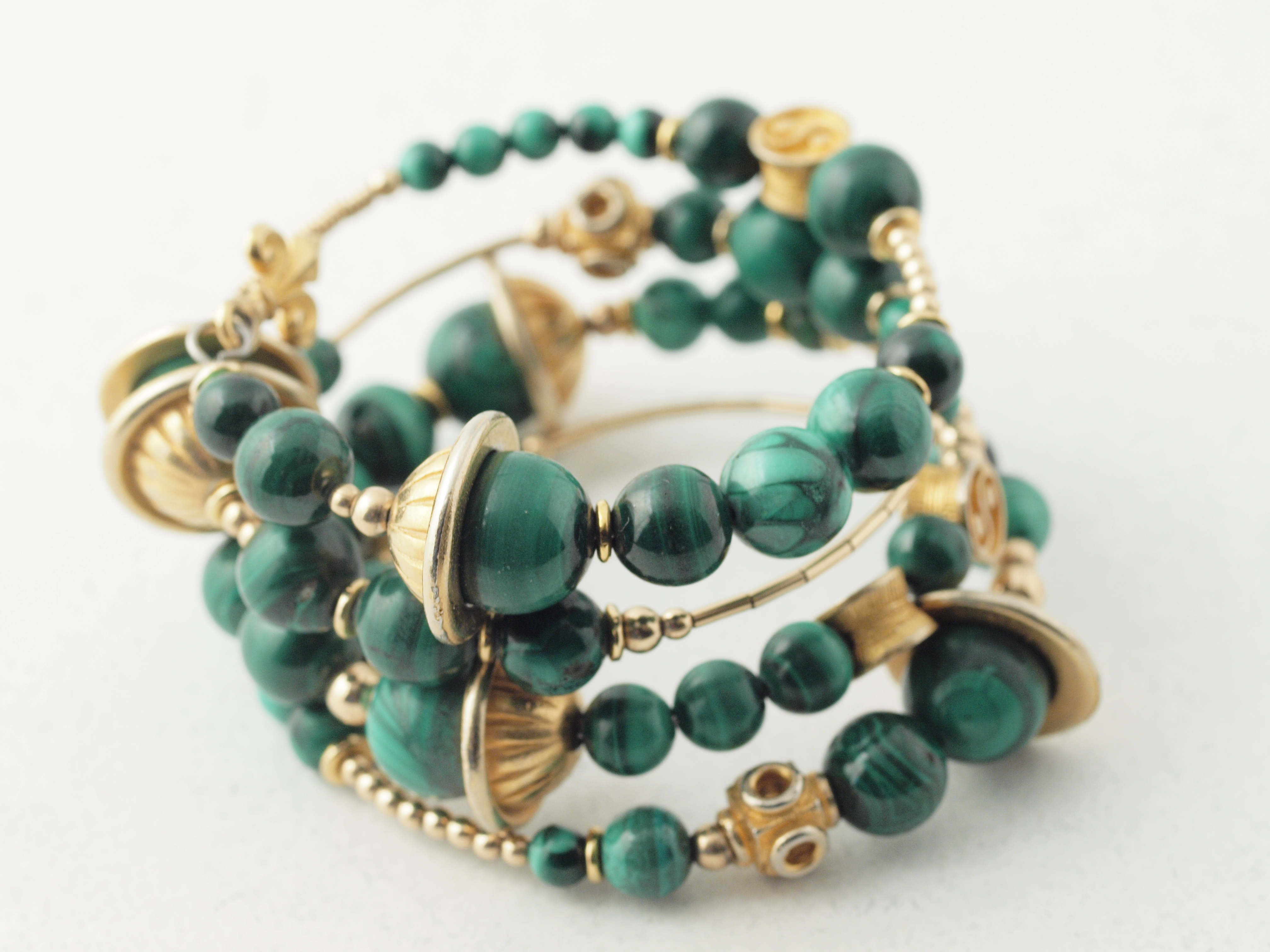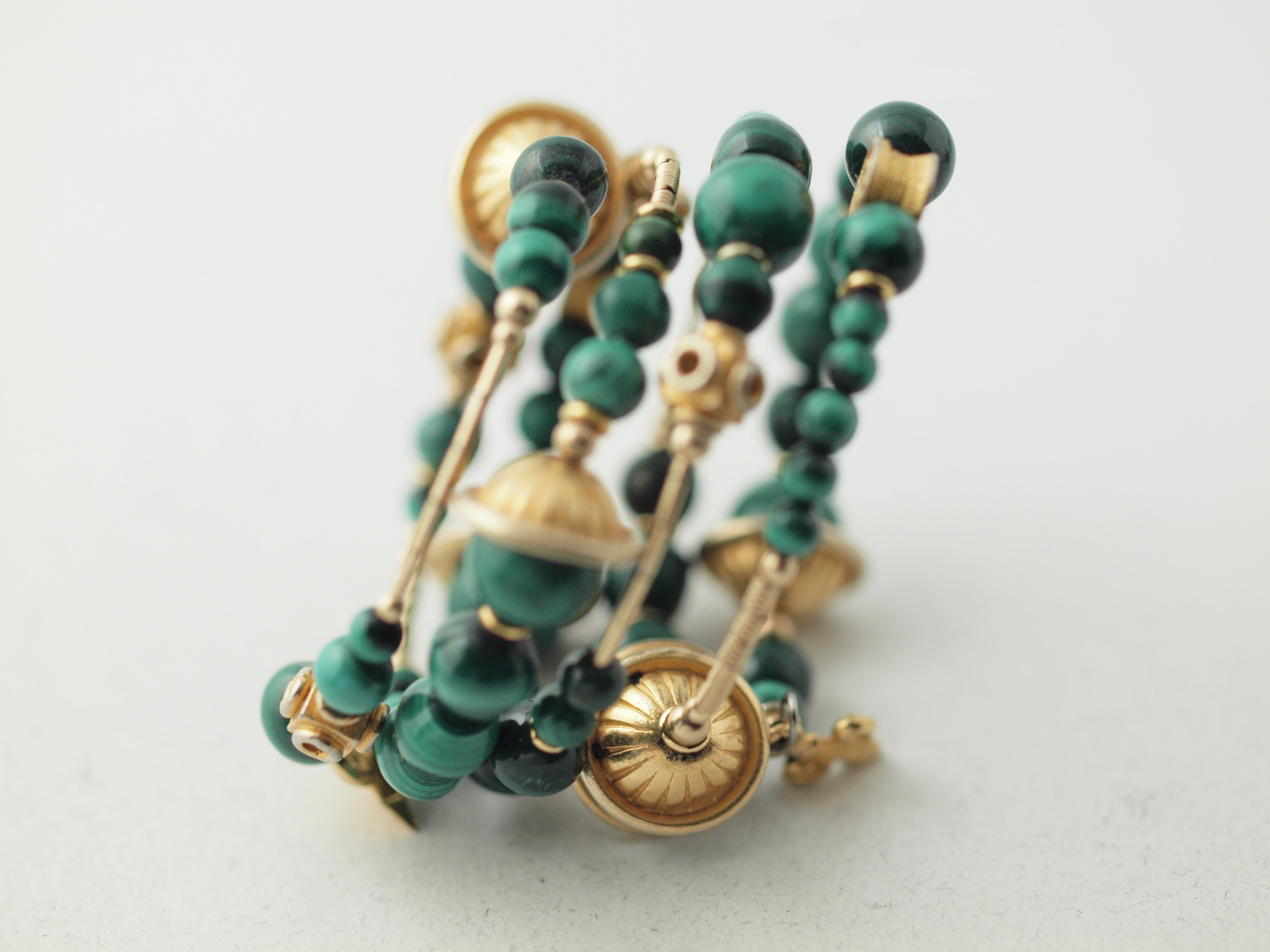 malachite, gold-fill, gold-plate and gold tone metal beads; photographed 27dec12, olympus E620, 50mm zuiko macro prime, 1/25s, iso 640, f/8, ev0; photoflood lighting on pale flecked paper background. All images on this page are out of the box, not even cropped.[1]