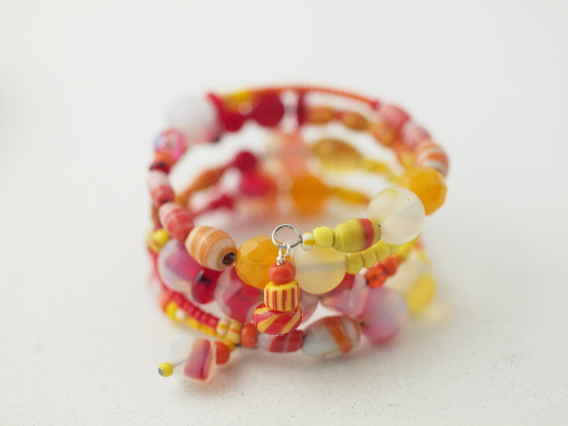Memory wire bracelet; assorted glass beads, including some Indian wound striped lampwork; steel, silver findings; zuiko 50mm prime macro, f2.5, 1/400sec iso 640 27dec2012