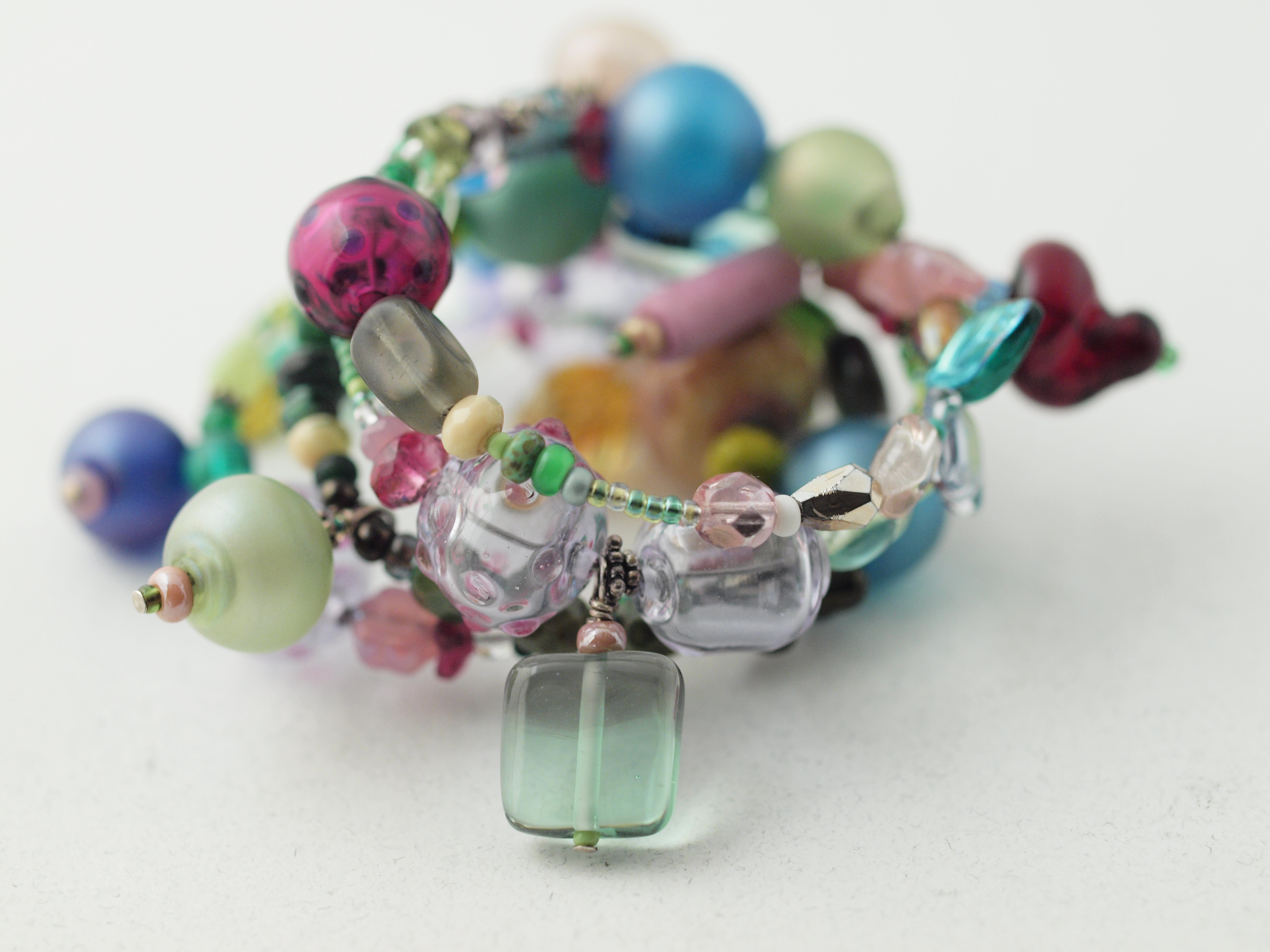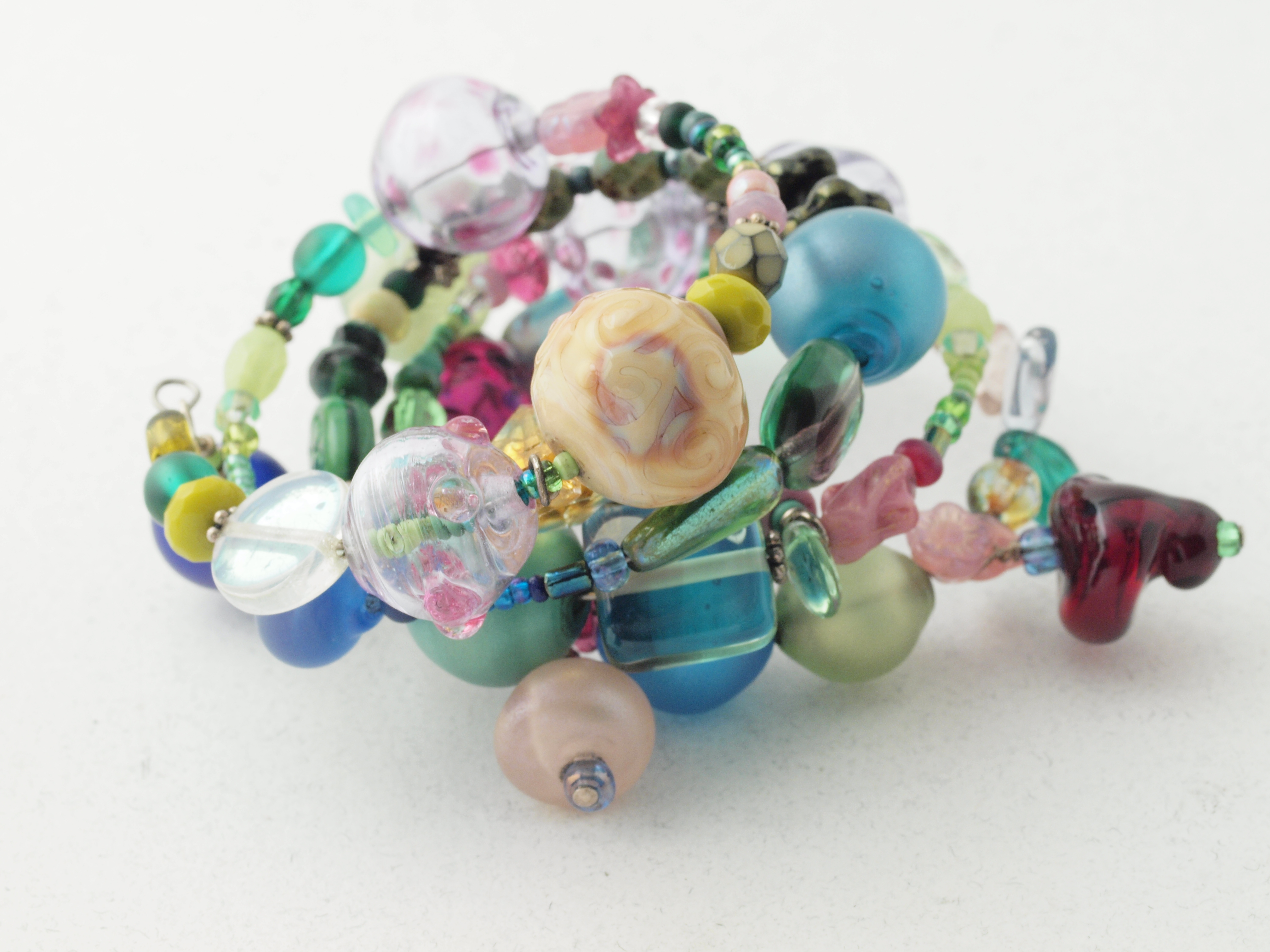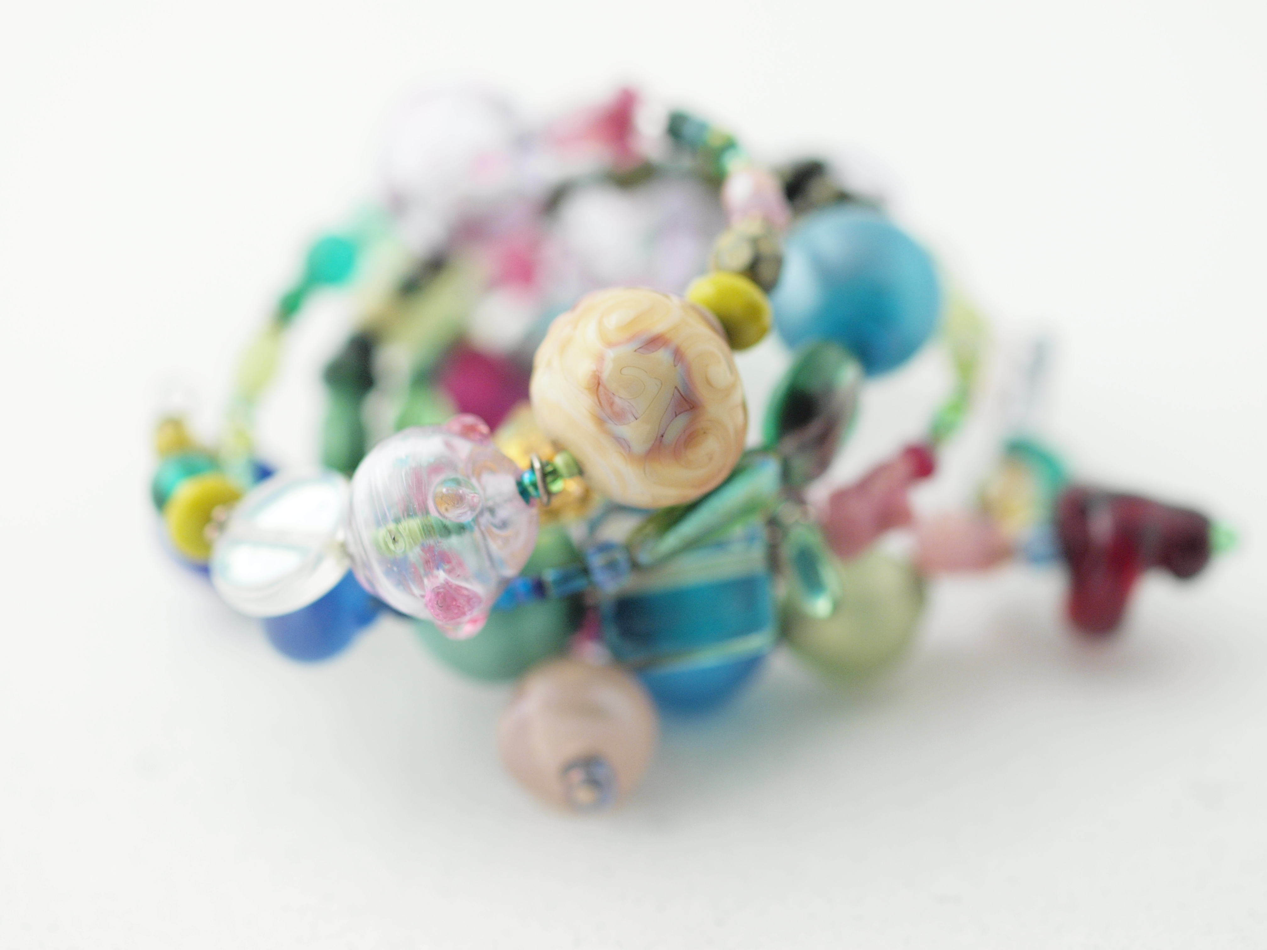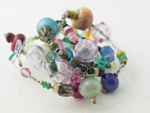 Memory wire bracelet featuring glass lampwork beads, czech pressed, and seed beads; bali silver; sterling? and memory wire metal components. Photographed with zuiko prime macro/oly E620 1/250sec f3.2, iso 640, ev 0. Obviously lit with photofloods