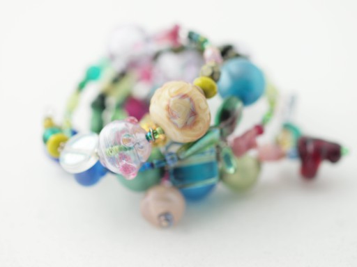 Because the bracelet is so visually busy, partly from the many dangles, I really like the reduced focus, which helps to push your eye towards the less chromatically intense transparents in the foreground.