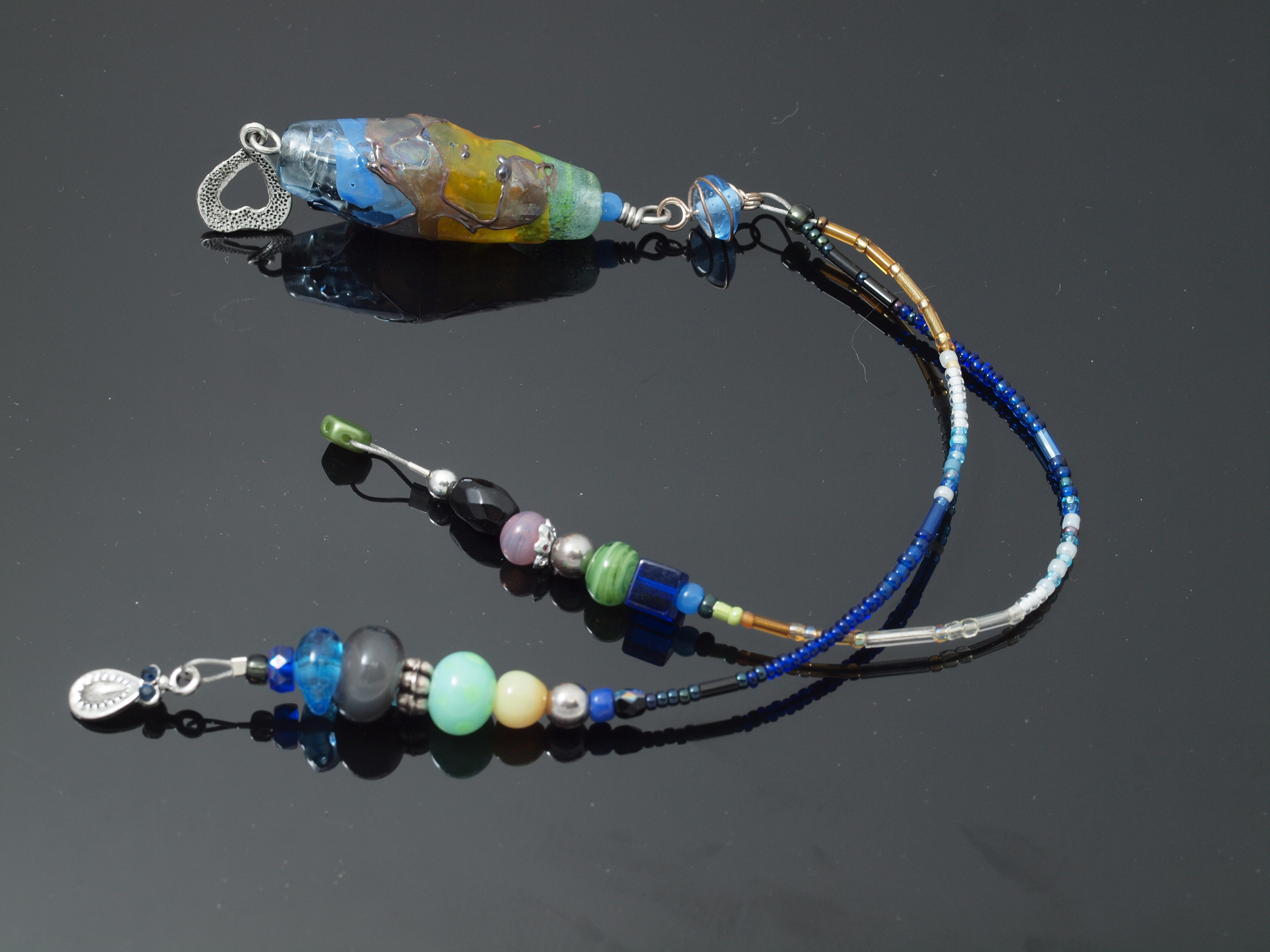 This mouse is actually a little more mouse-shaped, as it features a barrel bead in very light transparent cobalt shading into pale green (from transparent thompson enamel, I believe), with amber, medium blue, and silver plum (grey-violet) shard accents.