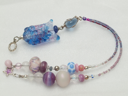 There are some gifts in this piece, starting with the wire-wrapped light blue bead that serves as the piece's joint; the cased pink bead with frit is from Cindi B, as is the dotted blue and white bead. —In fact, the seed beads were from mixes and also were probably gifts.