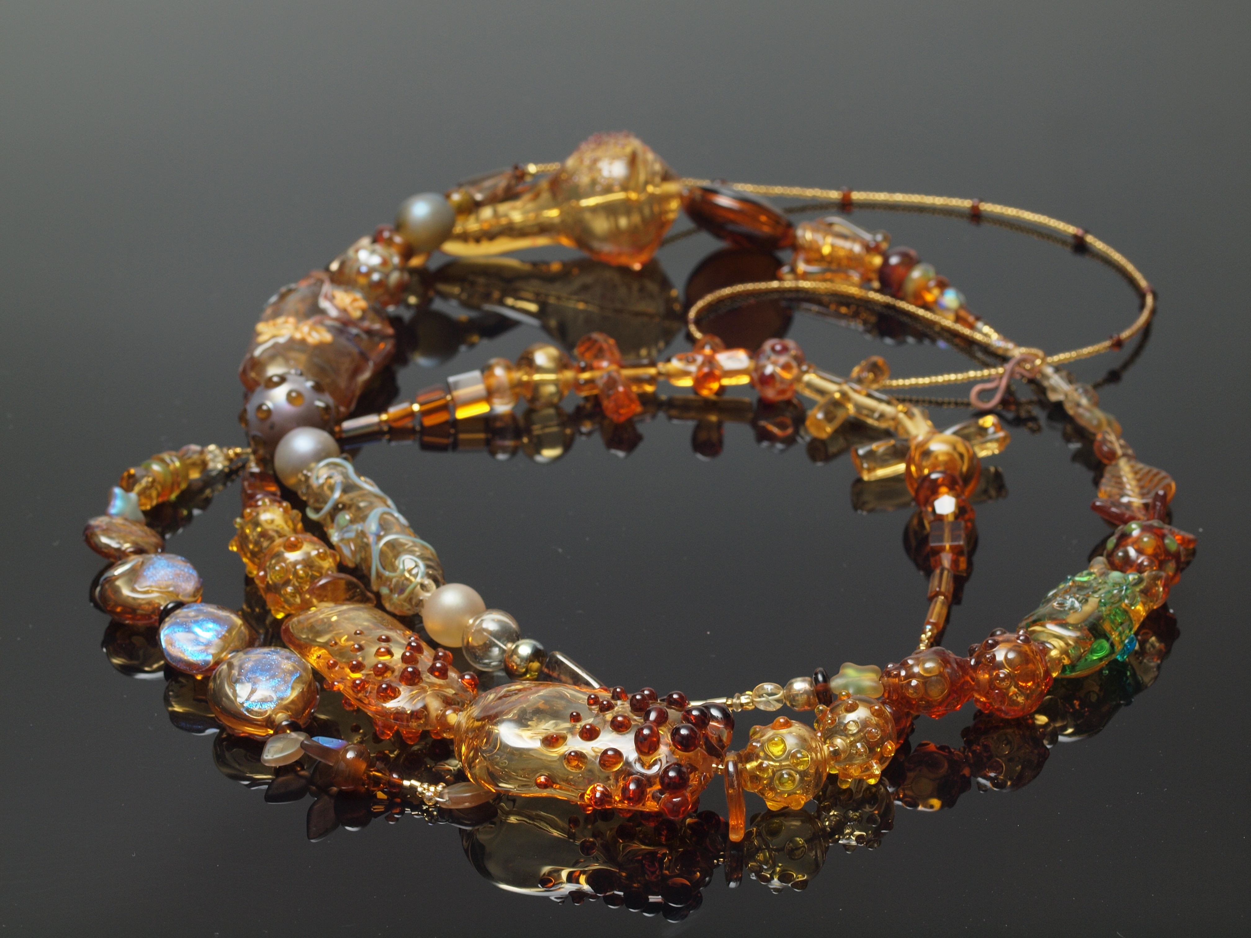 Bead curtain strand of no particular excitement. Amber beads, active section roughly 5’, 78" overall, including leader. Lampwork, other glass beads, tigertail, basemetal crimps, artist forged hook of copper wire.