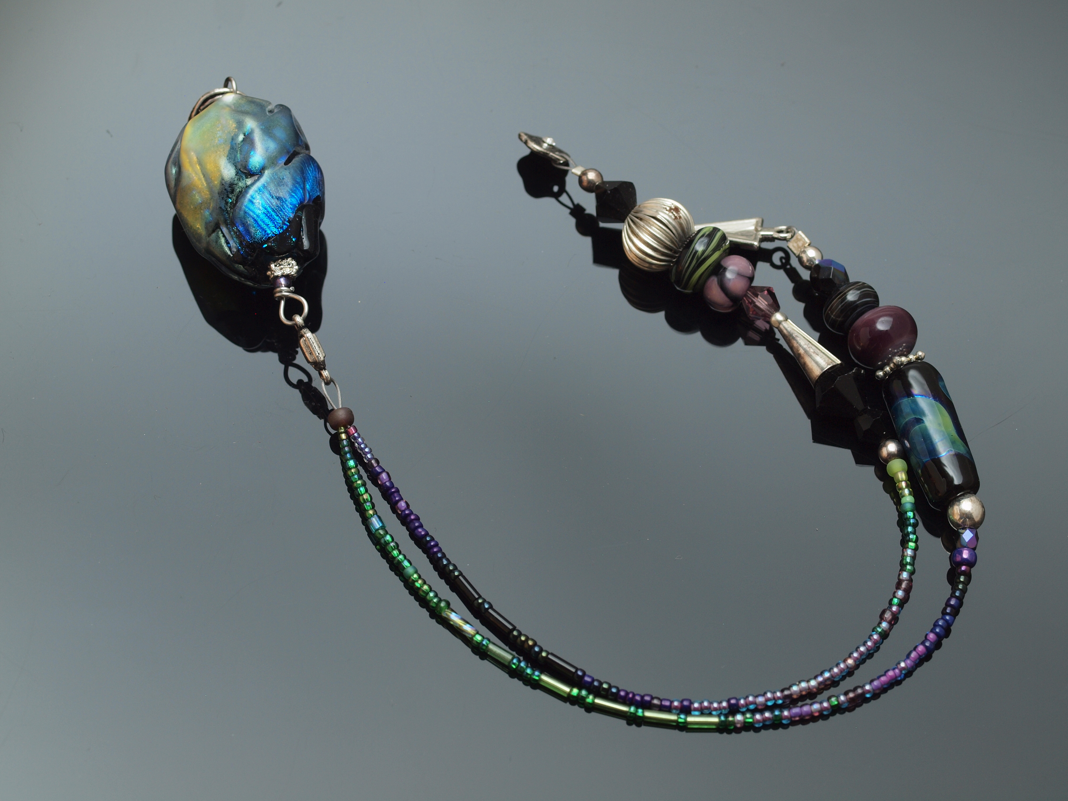 dead mouse, assembled & photographed Dec 12, 2017[1] . Silverplate, basemetal, stainless steel, lampwork; focal, 25mm/1", 29.5cm/11.75" overall