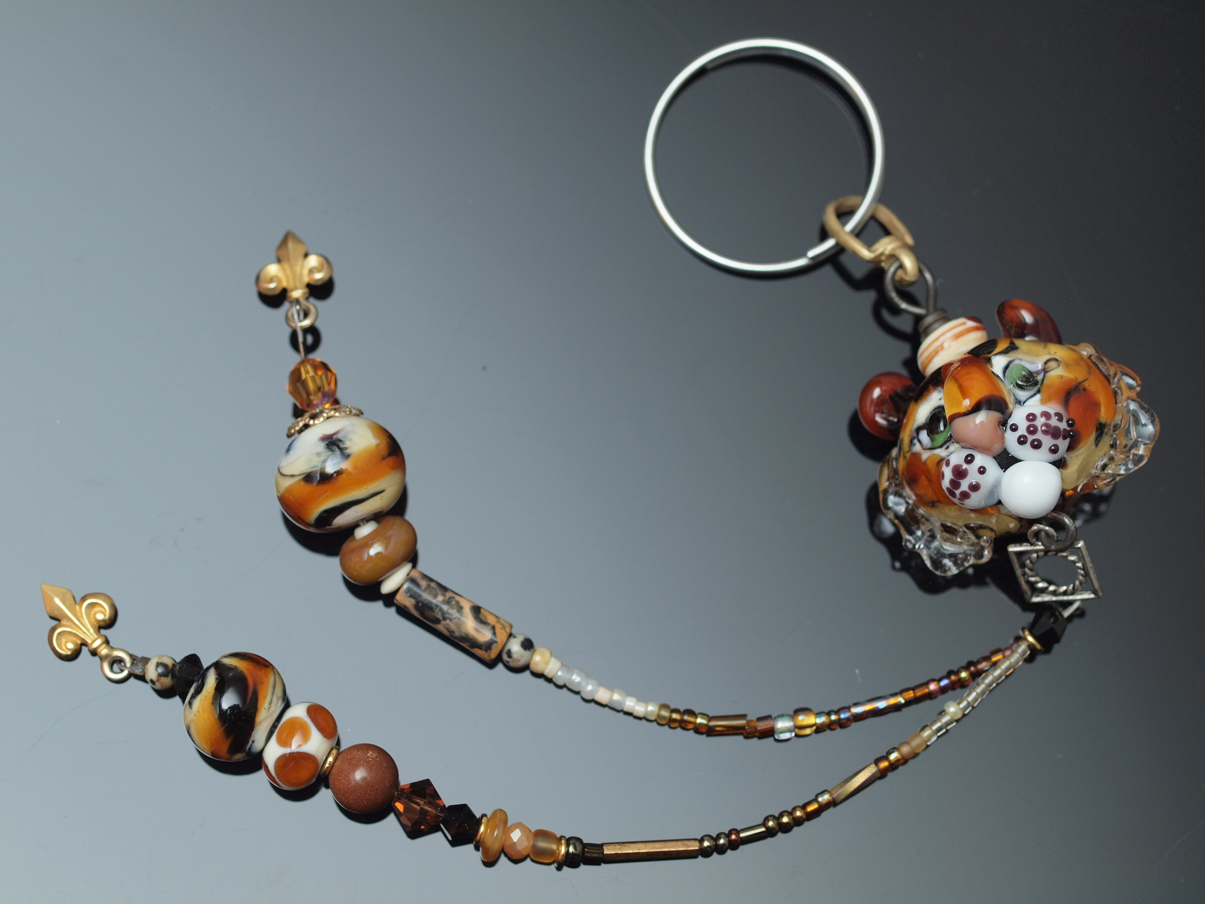 Tigerhead dead mouse, strung Dec2017 of beads manufactured earlier. Lampwork of soda lime (effetre) glass, semiprecious (leopardskin, goldstone), glass/crystal, base metal, beadalong. Photographed dec, zuiko macro lens, Oly E620.