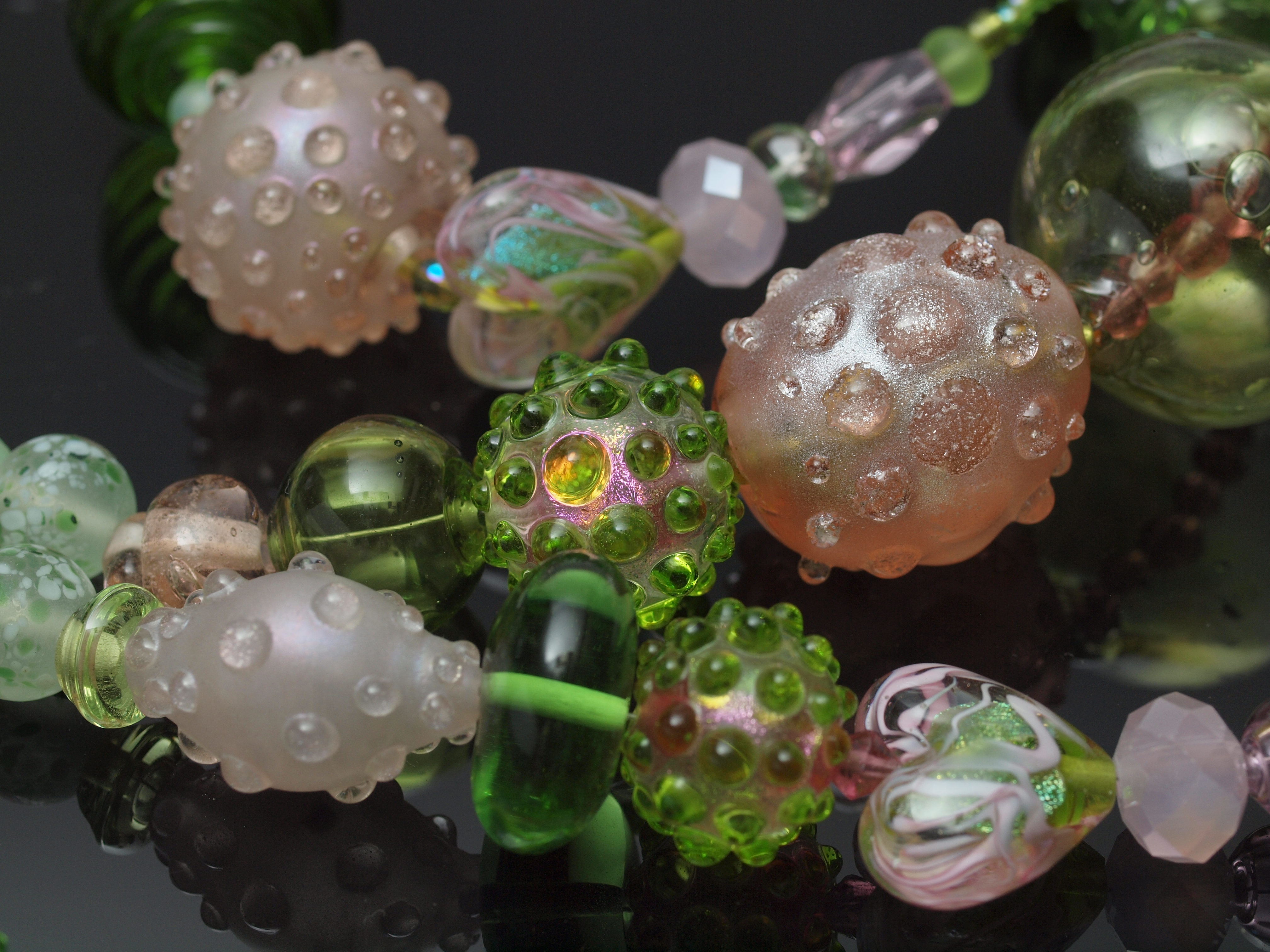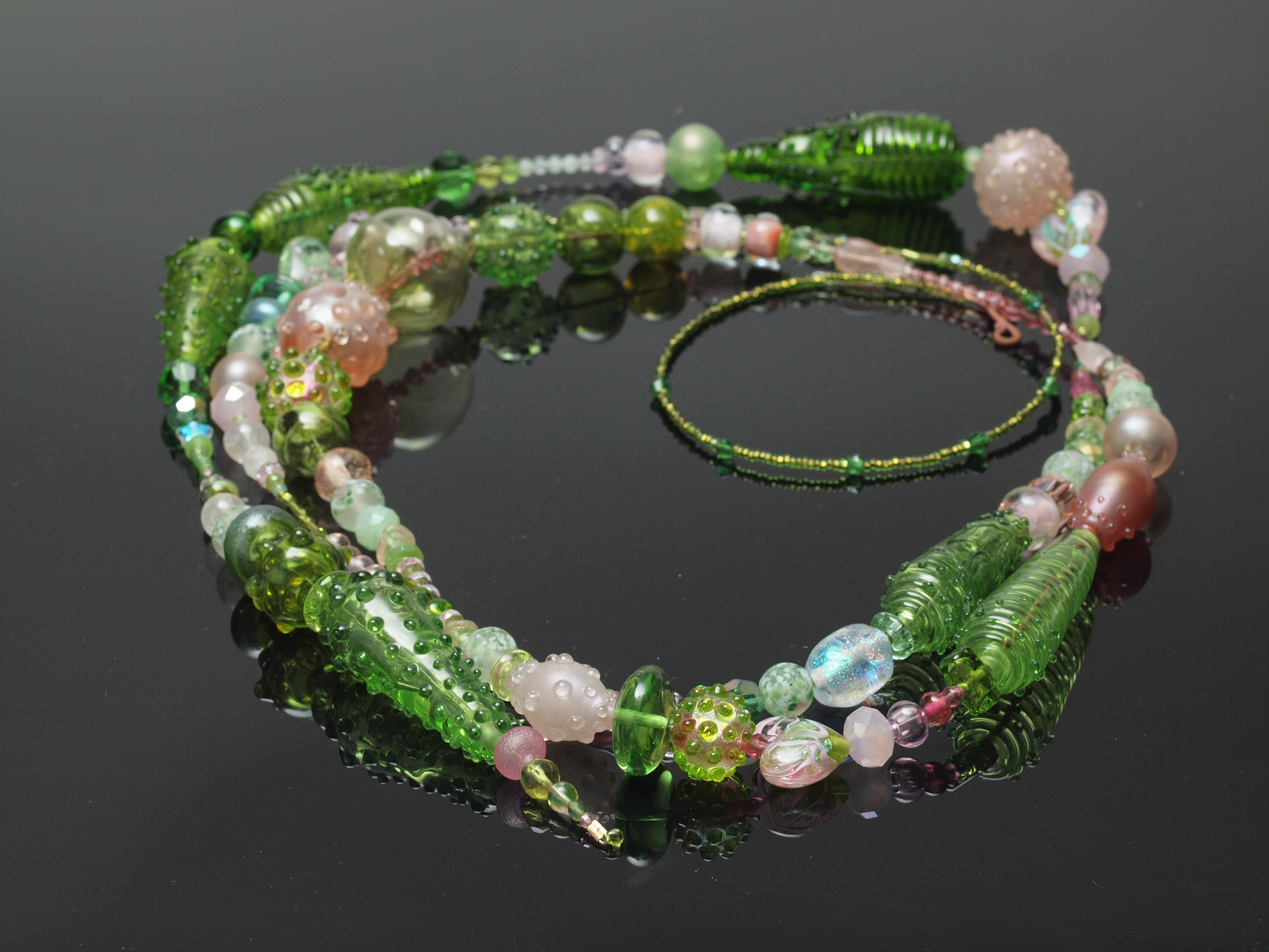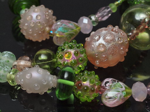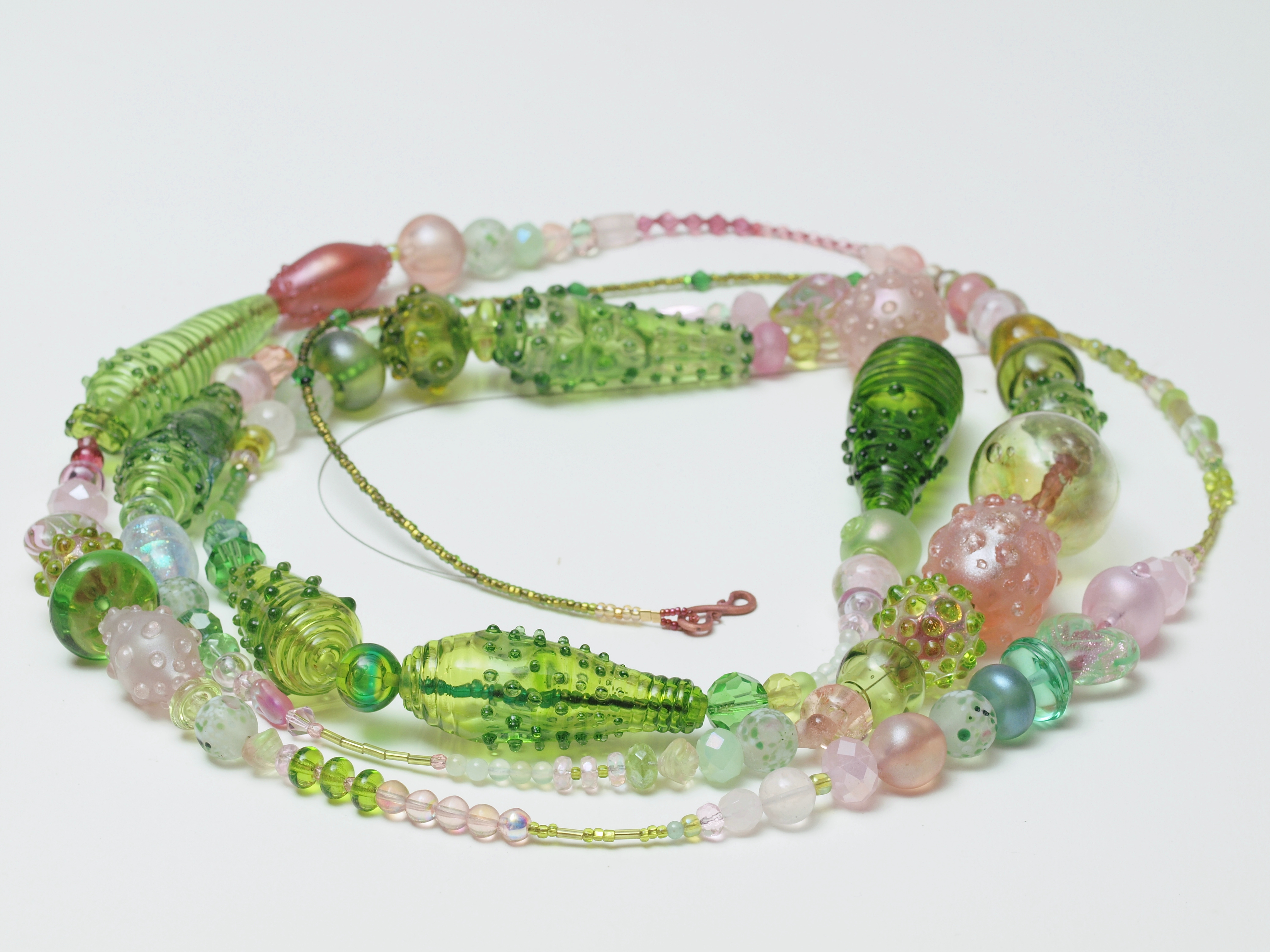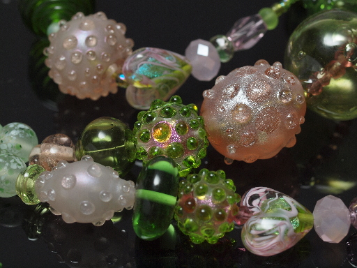 The green hollow on the right with diamond shaped dark pink beads is blown, and poorly made, but the huge hole on one end did allow me to do some fun double-stringing.