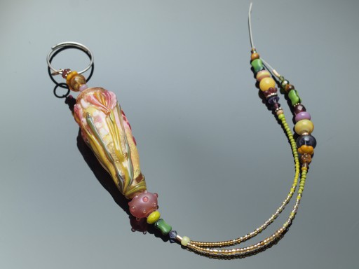 Alas, someone dropped it on concrete and it suffered major damage. I wasn't so upset at having to replace the focal, but was sad that the accent bead just below, originally a striped raked lotus made with a unique BE multi-coloured sort-of filigrana cane (no longer available) broke, cuz I just loved that bead. However, after months of not making a replacement, I finally just hunted around in my bead tray for something else—in this case, an old pixie dottie, made, iirc, from a batch of German (lauscha) pink glass from some ‘glass of the month’ club thing I participated in years ago.