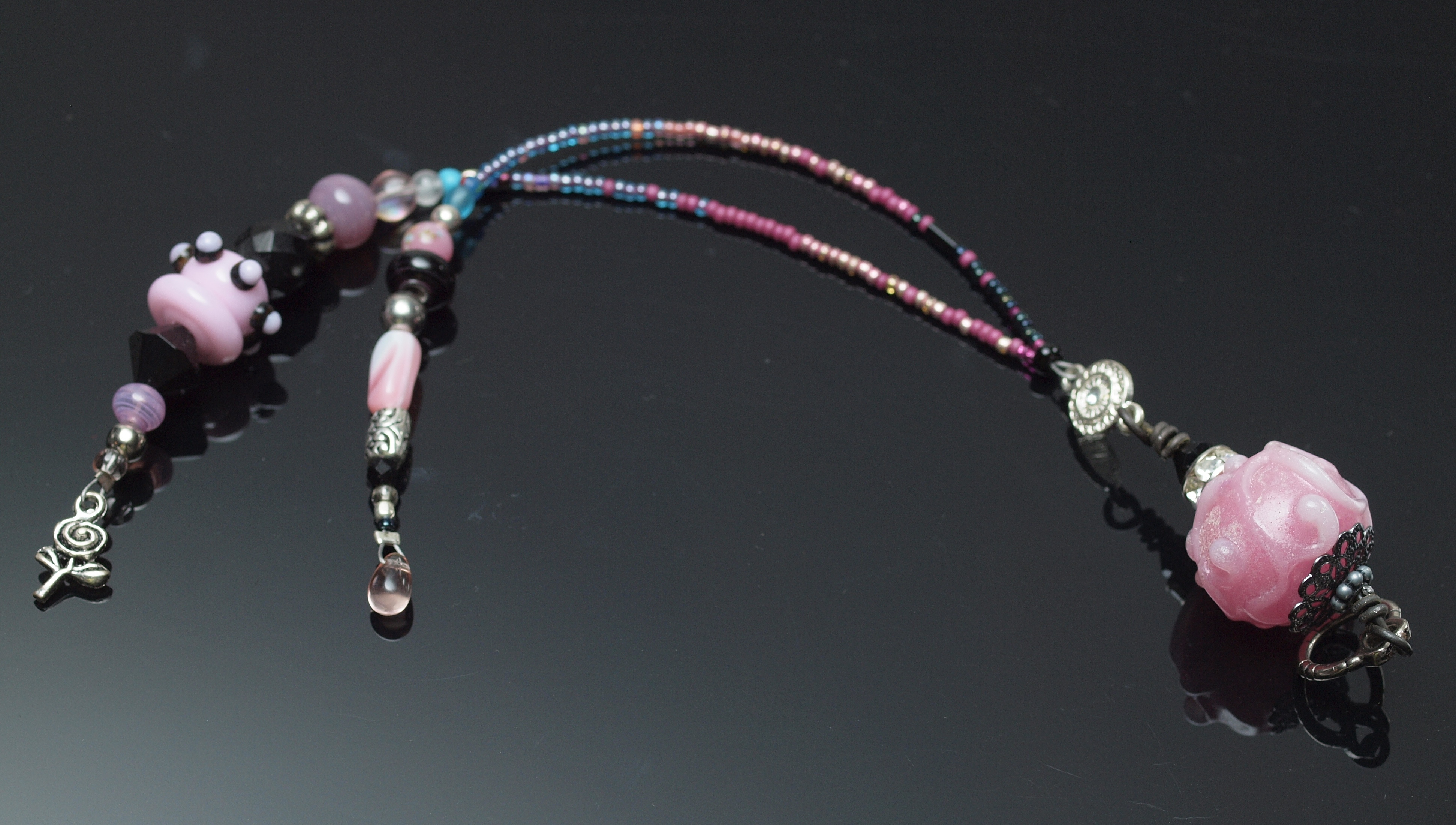 wftda themed dead mouse. Lampwork beads, glass, base-metal, beadalon. December 2017. Photographed 17dec17, zuiko macro lens, oly E620.