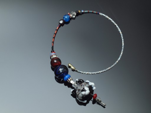 The first one was made with beads lying around on my table, in translucent reds, white/ivory, black and blue, so I stuck with that basic colour scheme for these as well, and continued the slow cleanup of my stringing area by incorporating beads lying around. This one features all sorts of weird stuff—a rhinestone rondell, a pulled striped ground trade bead (just atop) and a couple of not very successful gravity swirls—the one with transparent stripes is too dark to read well, and the opaque red didn't show up well black stripes either. Chintzy bugles finished off the project.