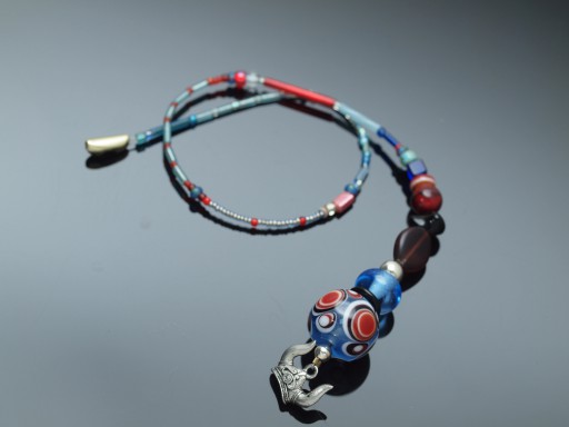 The red and white were left over from xmas beads, black co-ordinates (& is easy to use) with red and white/ivory, and I thought the light blue would make a nice background, which determined the colour basis for the series. Bonus is that the light shines through the blue in an appealing way when the light is on.