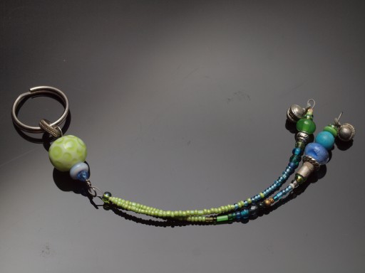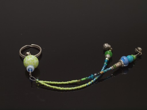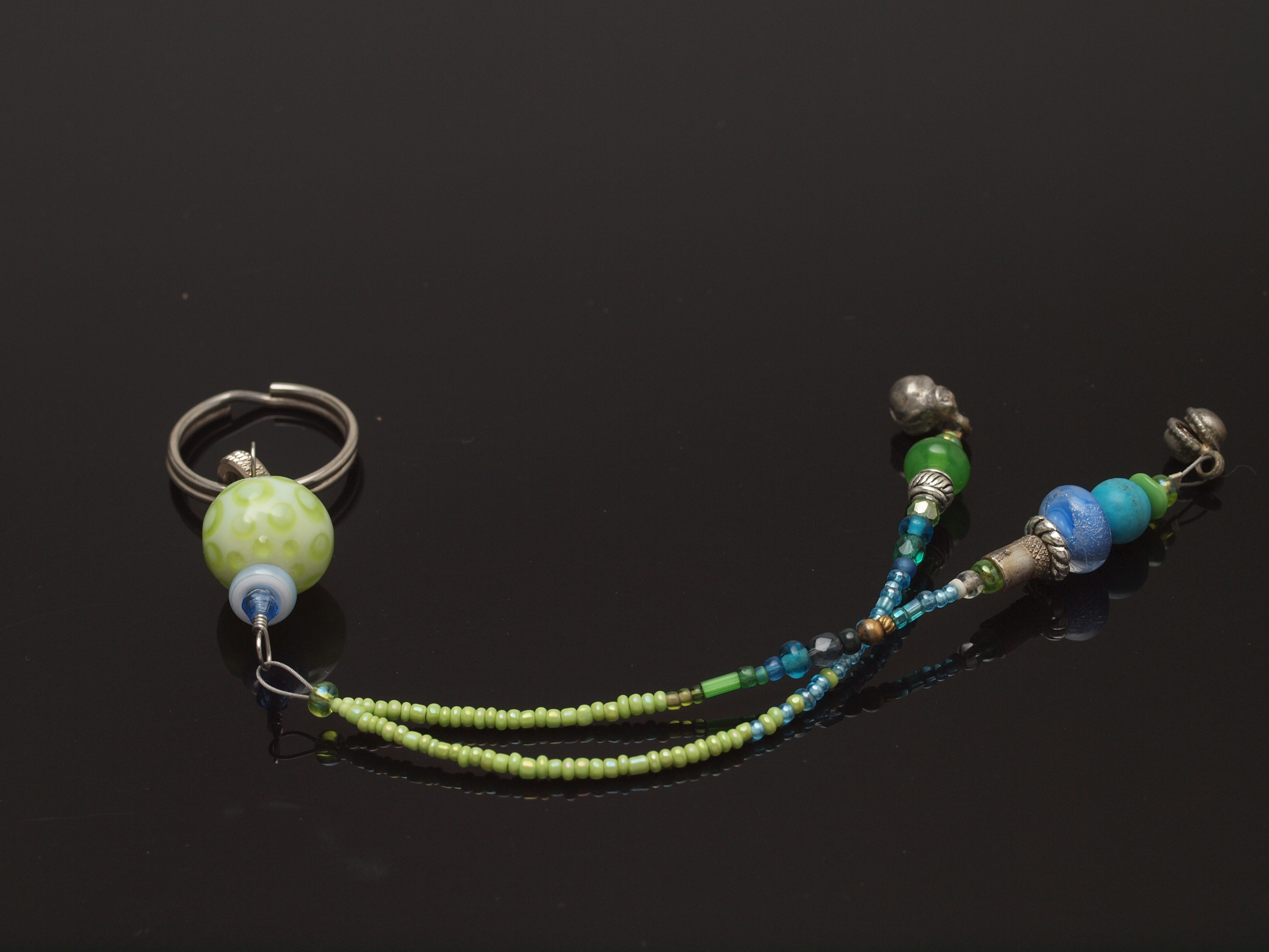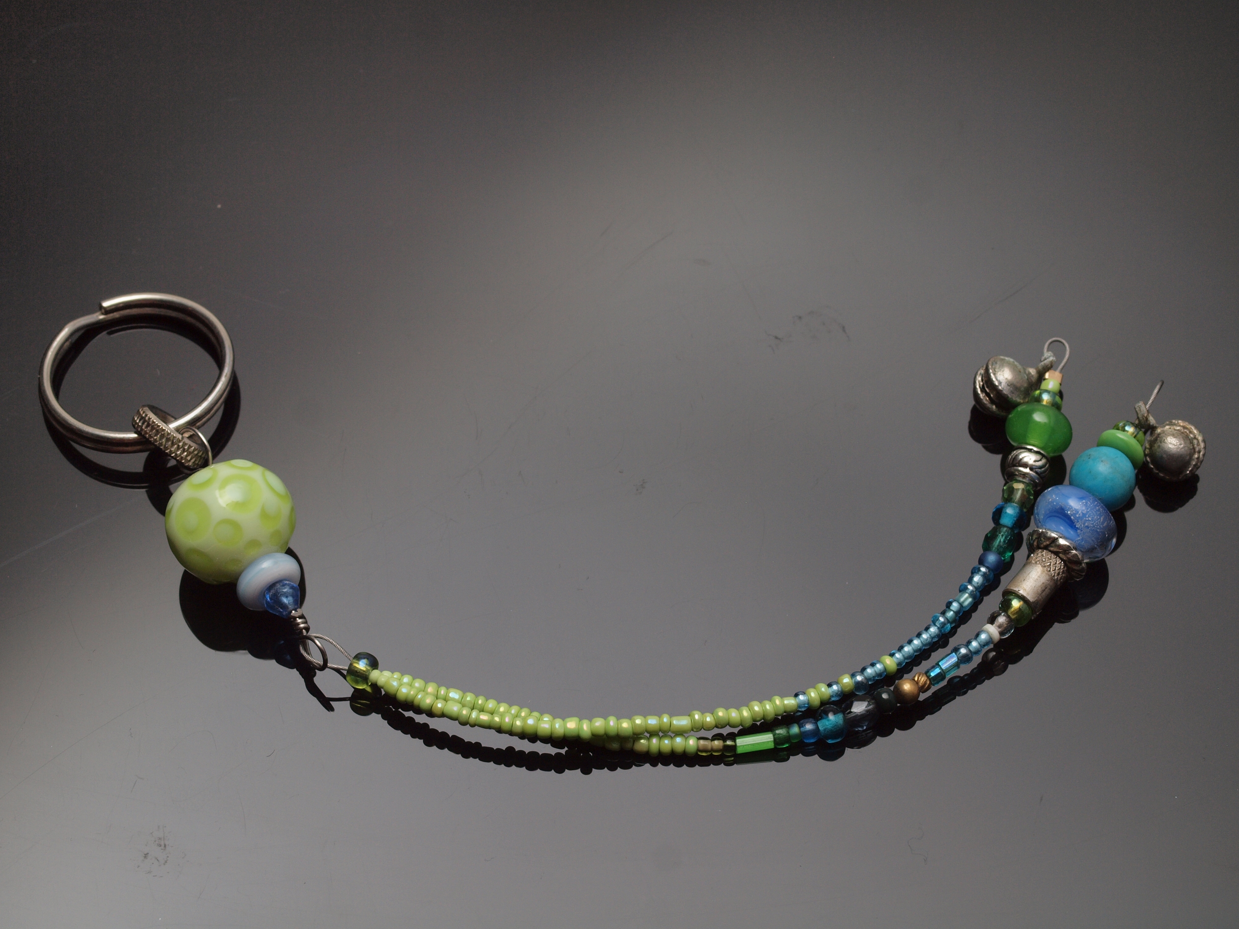 mini-mouse featuring lime green and white designer bead. Photographed 31jul2018. focal 13mm, 6.75" overall. Glass, basemetal, grungroo; one turqueoise bead, another with a bit of dichro. I think that tubular metal bead is a part from bike tire or similar.