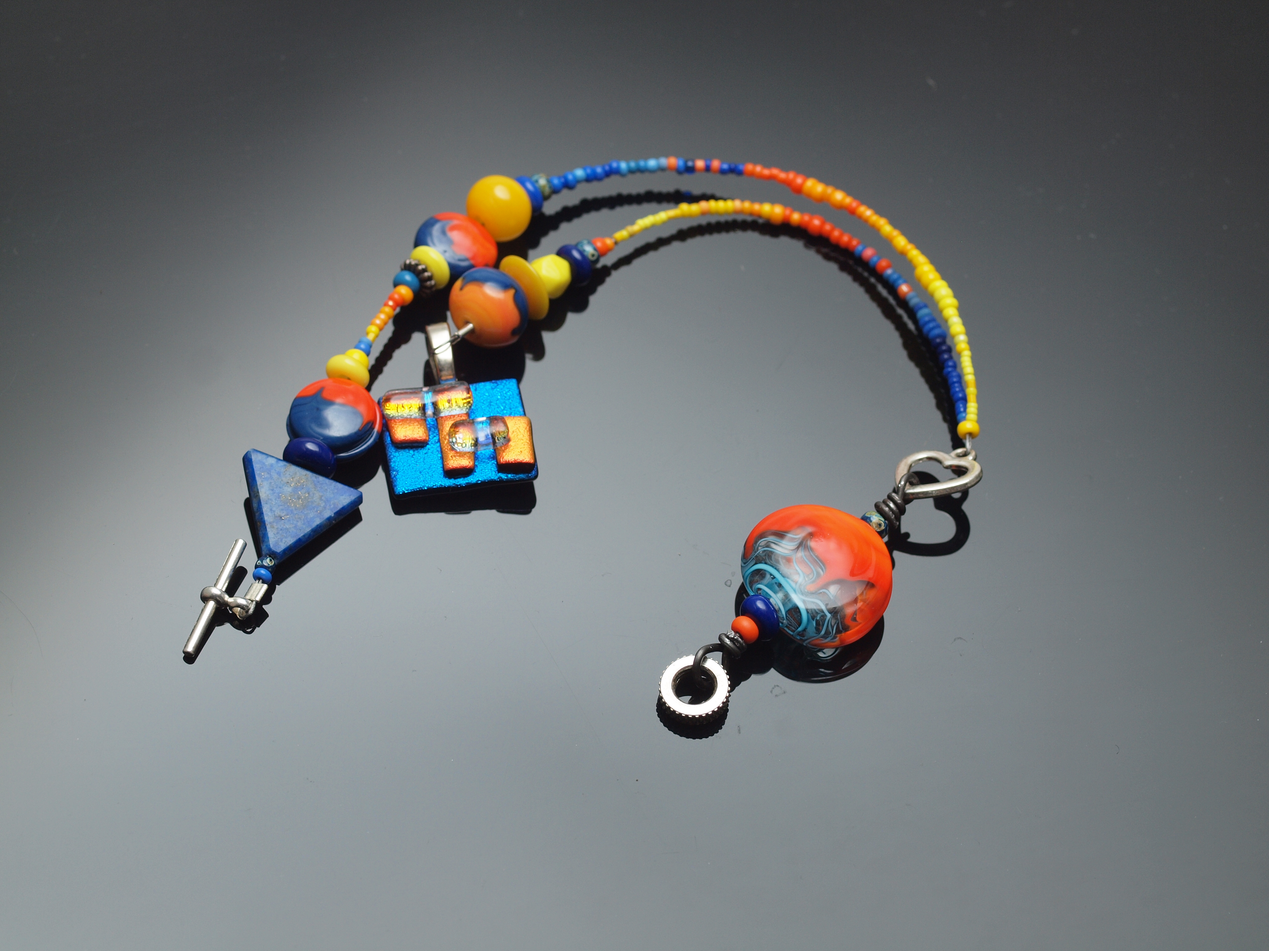 dead mouse featuring raked orange and blue beads, as well as a found dichro fused pendant. Lapis lazuli triangle bead.