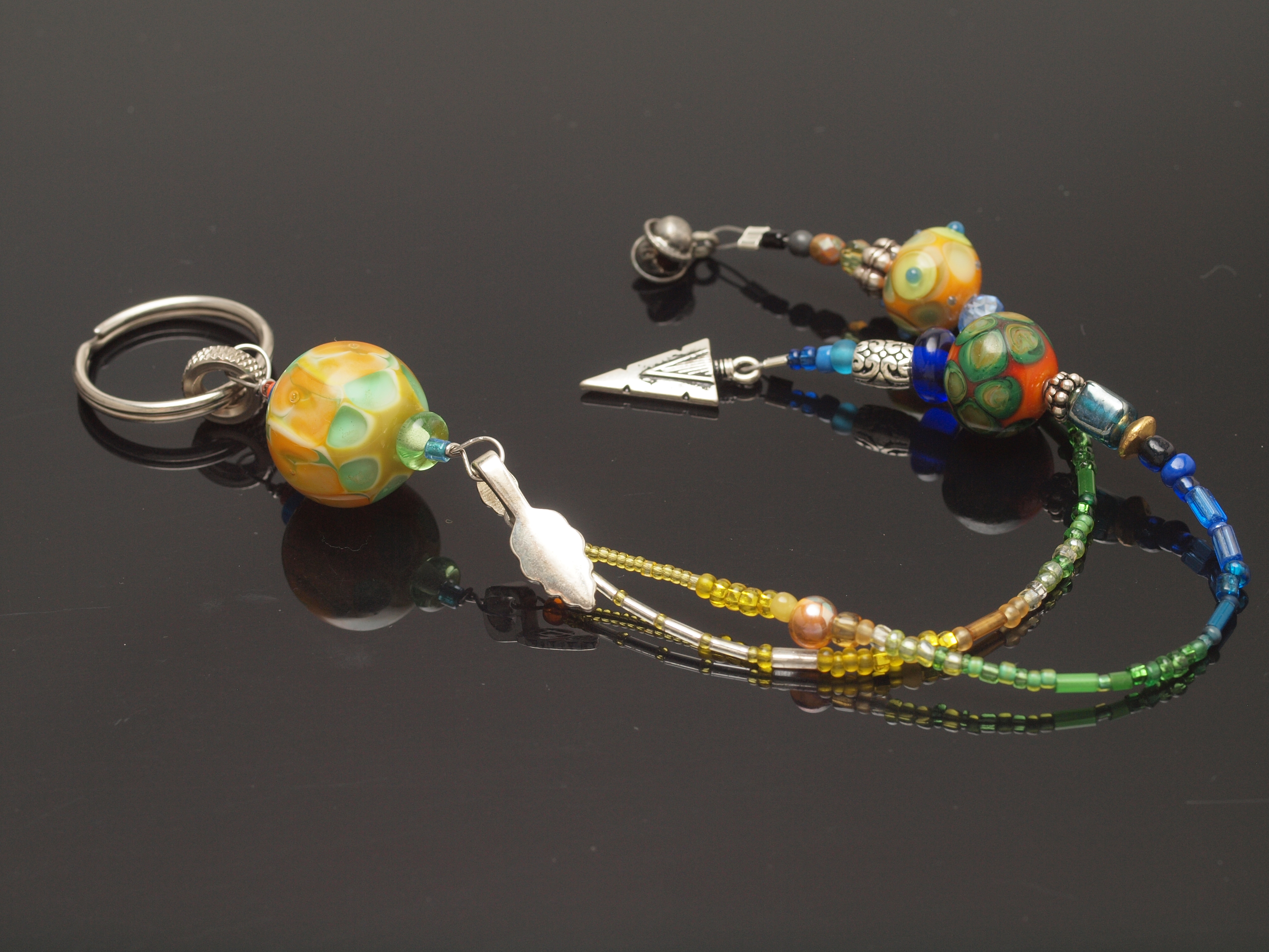 The focal plunged dot design is based on a style developed many years ago by Kristina Logan, and which she's long since abandoned. I love her current disk series, but these were among my earliest favourites, and I amuse myself by attempting them every once in awhile. The dot beads on the tail tips are from another long running series, my efforts to make goodlooking orange and green beads. It's proven to be more difficult than it ought.