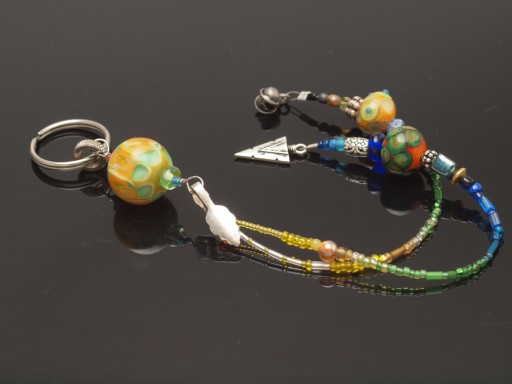 dead mouse: 9.5 inches from beginning of lock nut[1] to tip of the arrow shaped dangle. Focal: 0.75" in diameter. Effetre soda-lime lampwork beads, base-metal findings, beadalon, seed beads.
