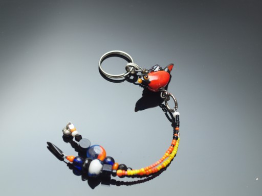 Since a significant other was being left behind, I thought that person might like a mouse with school colour beads incorporated as a representation of the beloved.[2] I didn't think either would want a big or long mouse, so these have—for me, at least—relatively short tails. Also, I used floral stringer for the bird's eyes, so as a result they have iris striations, a happy accident.