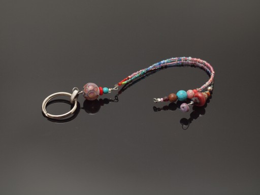 Nevertheless, I like the zing of little bit of red that otherwise livens up a somewhat bland pink-baby-blue-purple colour scheme. I think that reddish brown spacer all the way to the right is probably one of Fran's boro beads, and it tones pretty successfully with the goldstone just below the turquoise on the left tail.