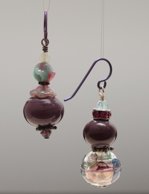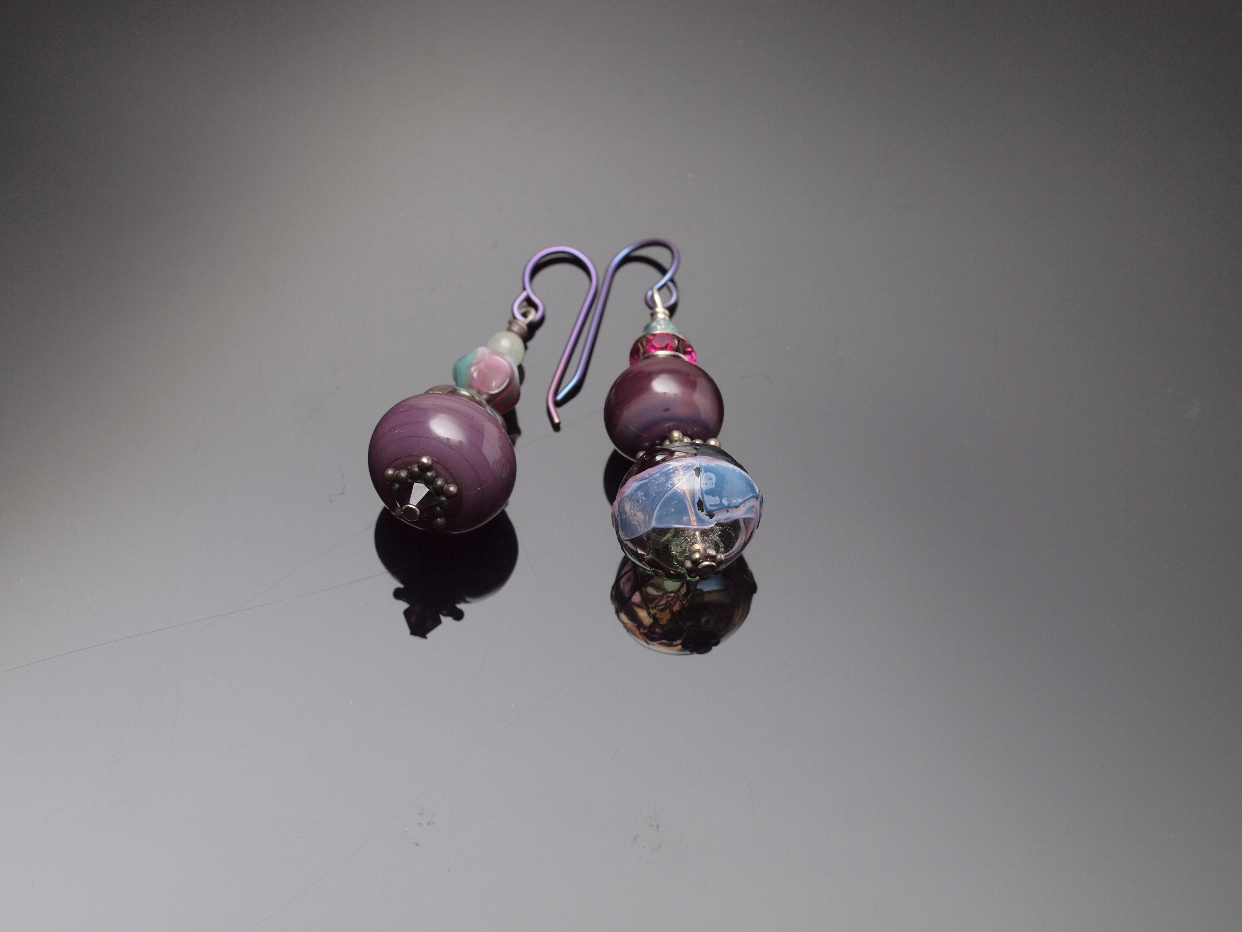 The earring on the left is half of a pair that I made for some sort of charity auction, and the purple beads are leftover CiM or Reichenbach sample strand hollows.